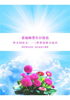 在法轮大法弘传世界二十八周年暨第二十一届世界法轮大法日之际,我们四川省内江市大法弟子感恩师尊慈悲救度!为拯救苍生,苦度众生,师尊您辛苦了! 恭祝慈悲伟大的师尊生日好! 四川省内江市三个学法小组大法弟子恭祝师尊生日快乐!