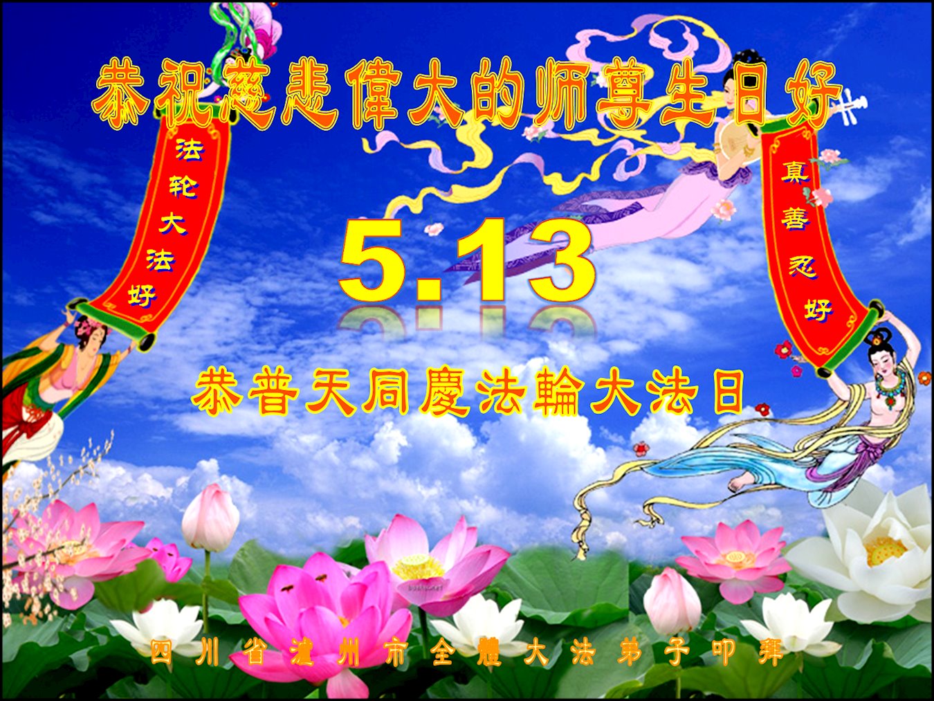叩谢慈悲伟大的师尊救度之恩! 庆贺法轮大法弘传世界二十八周年! 四川省泸州市全体大法弟子恭祝慈悲伟大的师尊生日好!
