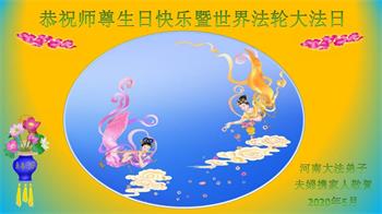 河南大法弟子夫妇携全家老少四代向慈悲伟大的师尊敬贺生日快乐!庆贺世界法轮大法日!