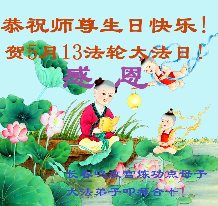 吉林省长春鸣放宫炼功点母子大法弟子恭祝师尊生日快乐!贺5月13法轮大法日!