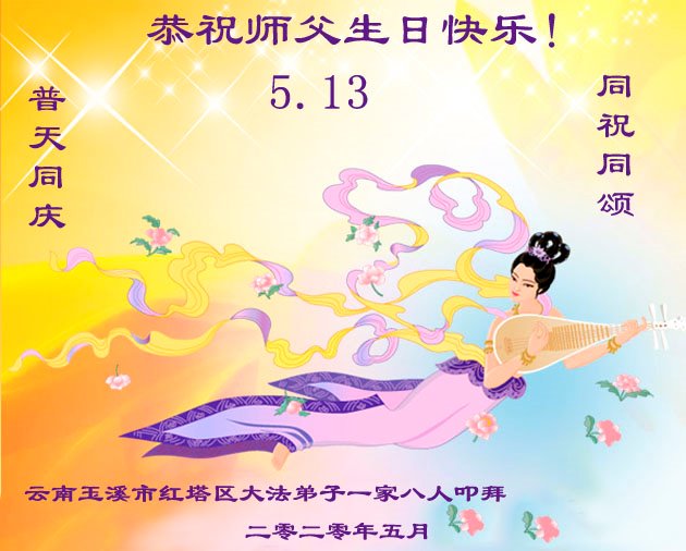 【明慧网二零二零年五月十三日】 云南玉溪市红塔区大法弟子一家八人恭祝师父生日快乐!普天同庆世界法轮大法日!