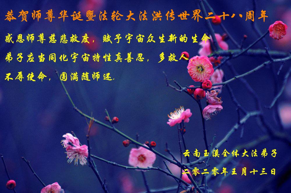 云南玉溪大法弟子恭贺师尊华诞暨法轮大法洪传世界二十八周年!