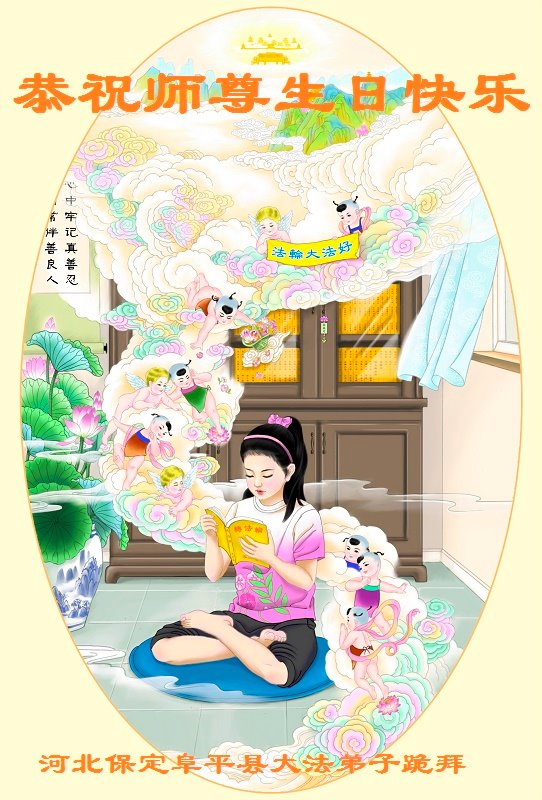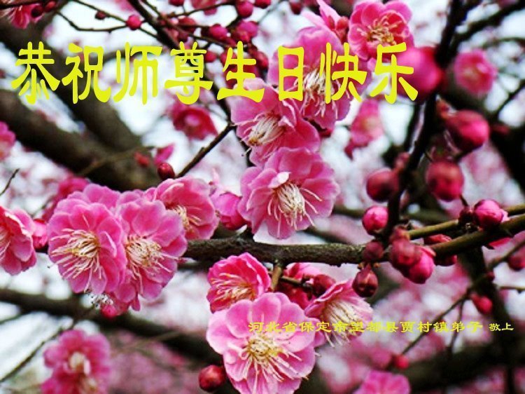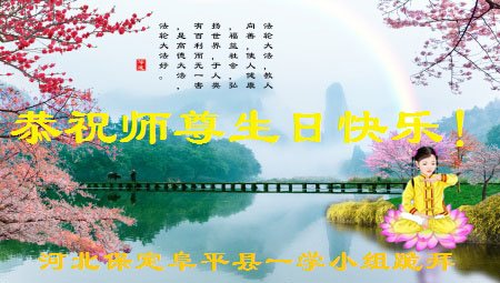 师父您好,我们阜平县全体大法弟子向慈悲伟大的师尊问好,祝师尊生日快乐!谢谢师尊的慈悲救度!感恩的话用千言万语也表达不了弟子的心情,只有在地球的另一端双手合十、跪拜师尊,遥祝师尊生日快乐! 河北保定阜平县一学法小组大法弟子恭祝师尊生日快乐!
