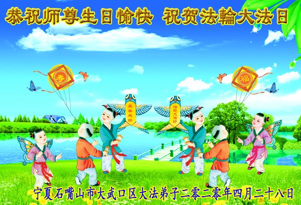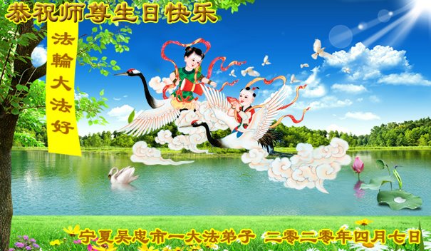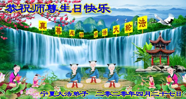 生生世世为得大法, 今生转世進了一家; 三件大事互补互修, 精進实修一齐回家。 二零二零年四月二十九日 宁夏石嘴山市大法弟子恭祝师尊生日快乐!祝贺5.13世界法轮大法日!