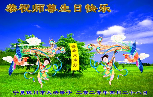 宁夏银川市大法弟子恭祝师尊生日快乐!祝贺5.13世界法轮大法日! 感恩师尊大法洪传, 真善忍好避灾驱难。 诚念能灭中共肺炎, 弟子精進齐登法船。 二零二零年四月二十九日 宁夏银川市大法弟子叩谢师尊洪恩!恭祝师尊六十九华诞!