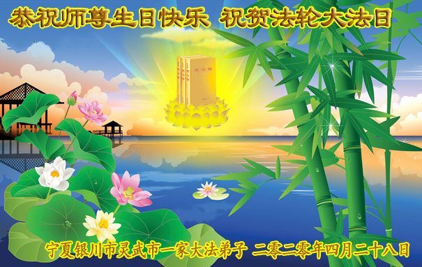 感恩师尊感恩大法, 捞起洗净救度我俩; 学法炼功多多救人, 随师正法随师回家。 二零二零年四月二十五日 宁夏银川市灵武市一家大法弟子恭祝师尊生日快乐!祝贺世界法轮大法日!
