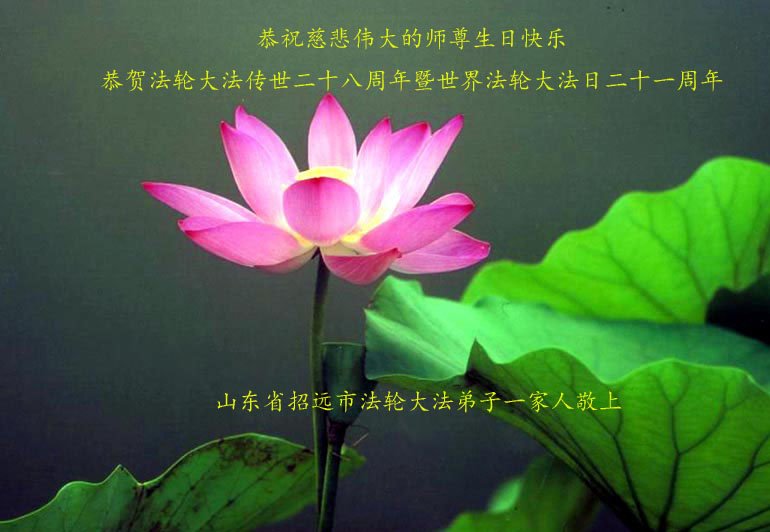 恭贺法轮大法传世二十八周年! 恭贺第二十一届世界法轮大法日! 师父您辛苦啦,弟子一定不忘初衷,做好三件事,跟师父回家。 山东省东营市大法弟子恭祝师尊生日快乐!