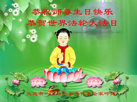 世界法轮大法日就要到了,我代表修炼的爷爷、奶奶、爸爸和明真相的妈妈恭祝慈悲伟大师尊生日快乐!我是大法小弟子,上小学二年级了,我经常和爷爷奶奶一起学法。我要多学法,按照师尊的要求去做,常念法轮大法好真善忍好,跟师父回家! 吉林省吉林市蛟河市明真相的大法弟子家属恭祝大法师父生日快乐!