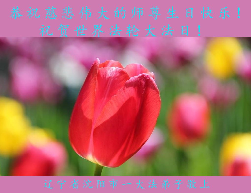 在这春意盎然的季节里,我们又迎来了第二十一届世界法轮大法日暨我们伟大师尊的华诞!恭祝师尊生日快乐!师尊您辛苦了!我们一定理智,精進、实修,多救人,报师恩!弟子叩拜师尊! 辽宁省沈阳市一大法弟子恭祝师尊生日快乐!祝贺世界法轮大法日!