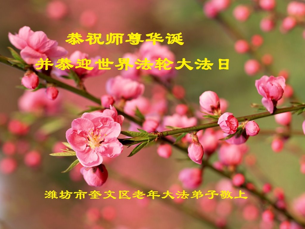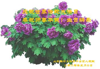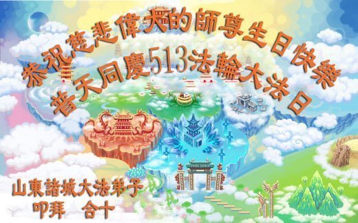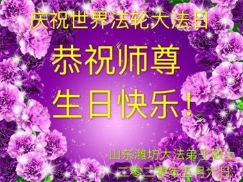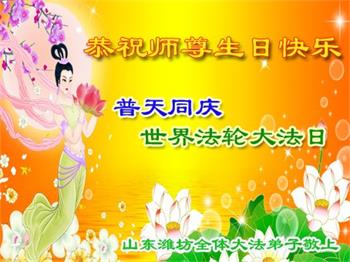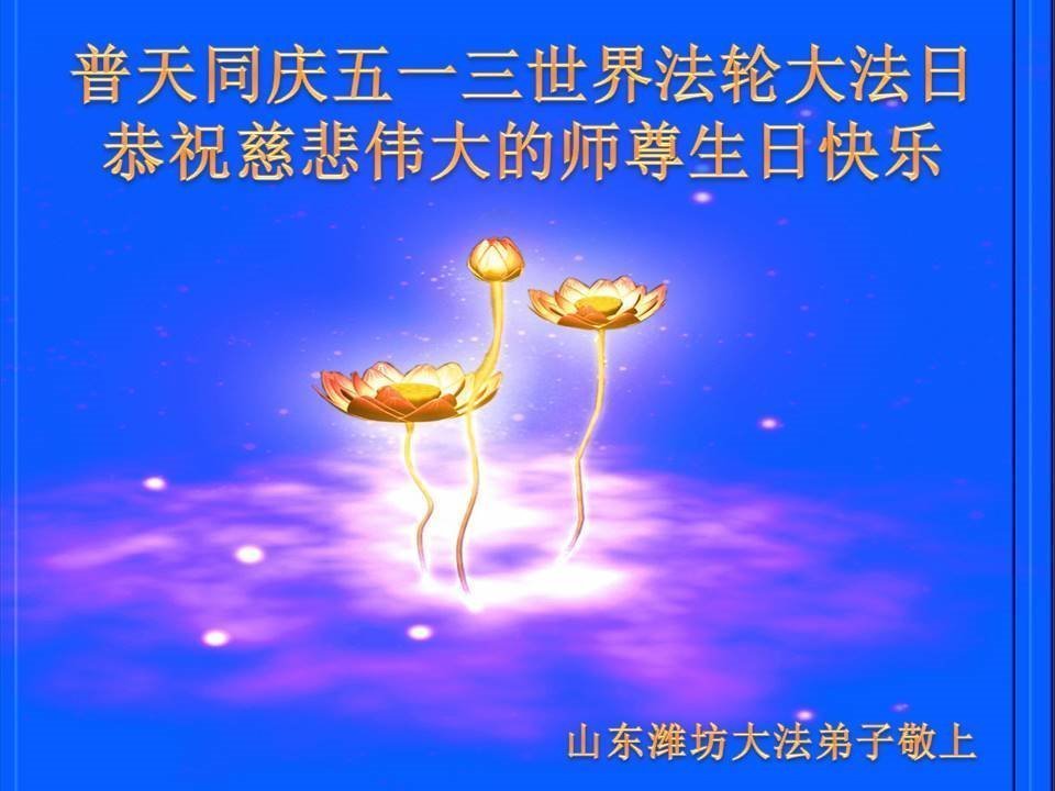 恭祝师父生日快乐!感谢师父的慈悲救度和看护! 山东潍坊全体大法弟子恭祝慈悲伟大的师父生日快乐!恭祝世界法轮大法日!