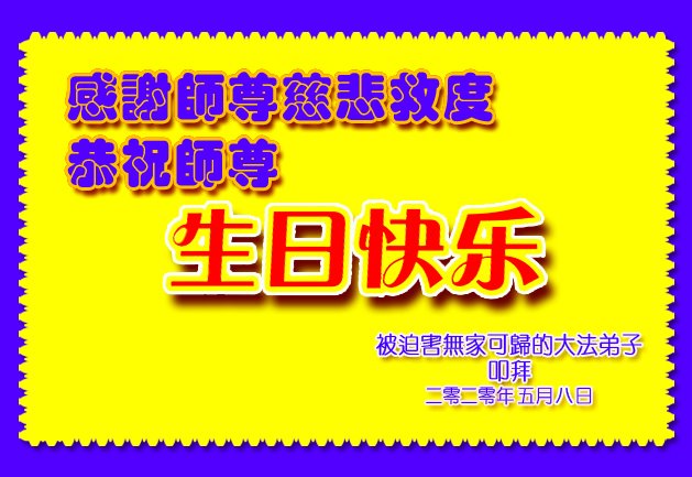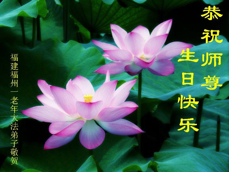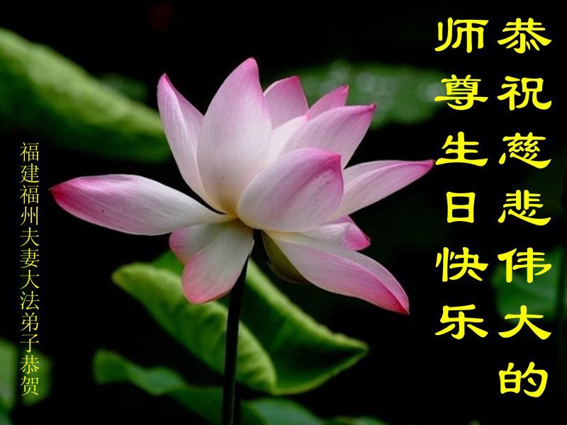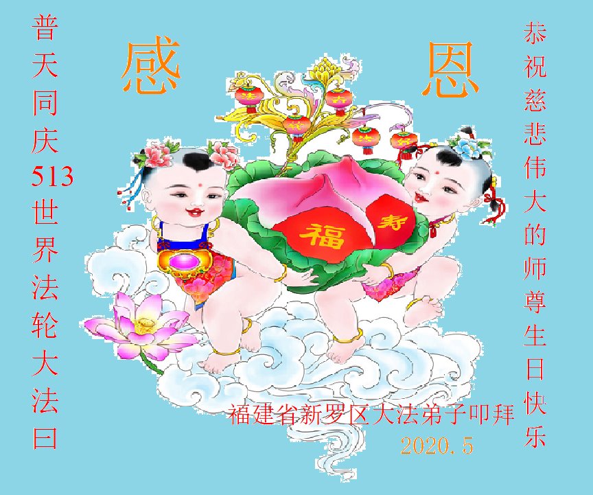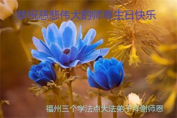 感谢师父慈悲救度!我们用尽人间的语言也无法来表达我们对师父的感激之情!我们一定会做好三件事,跟师父走到最后。 福建福州一老年大法弟子恭祝慈悲伟大的师父生日快乐暨世界法轮大法日!