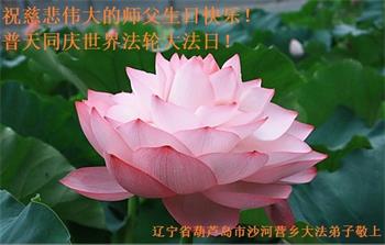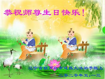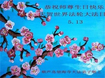 普天同庆世界法轮大法日! 时间过得真快,转眼又是一年。面对疫情,有更多的弟子走出来证实法,抓紧时间向可贵的中国人讲述真相。我们都明白,救人的时间真的不多了。我们会在法上做好我们该做的。请师父放心。 再次恭祝师父生日快乐! 合十 辽宁省葫芦岛市沙河营乡大法弟子敬上 辽宁省葫芦岛市杨家杖子经济开发区同修四姐妹恭祝慈悲伟大的师尊生日快乐!