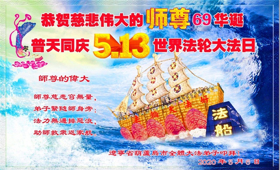 恭祝慈悲伟大的师尊69华诞!普天同庆5.13世界法轮大法日! 师尊的伟大 师尊慈悲穹无量, 弟子紧随师身旁。 法力无边排恶浪, 助师救众展辉煌。 辽宁省葫芦岛市全体大法弟子叩拜! 2020年5月6日 辽宁省葫芦岛市全体大法弟子恭祝慈悲伟大的师尊生日快乐!