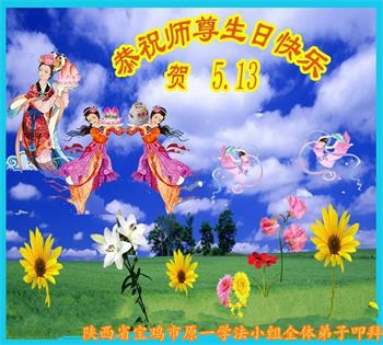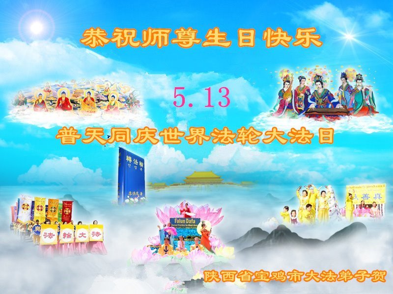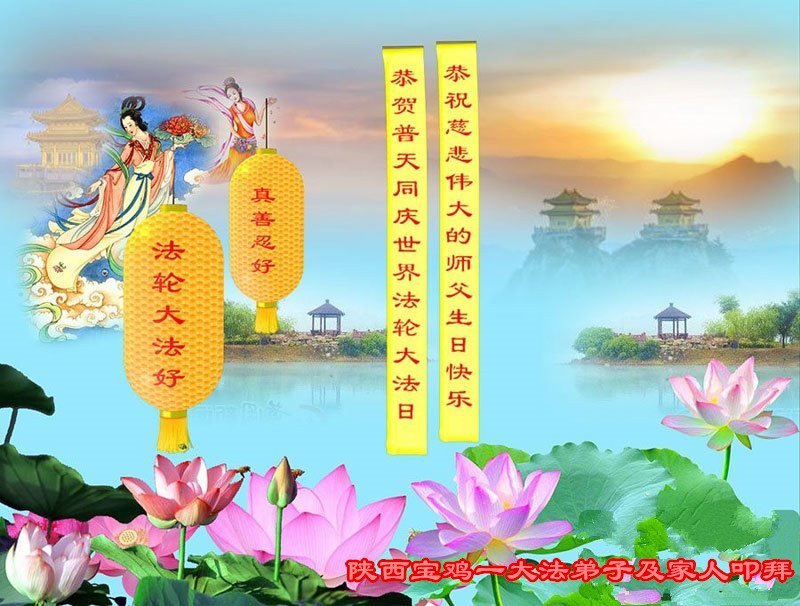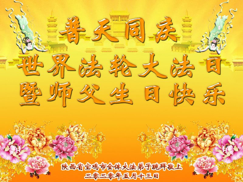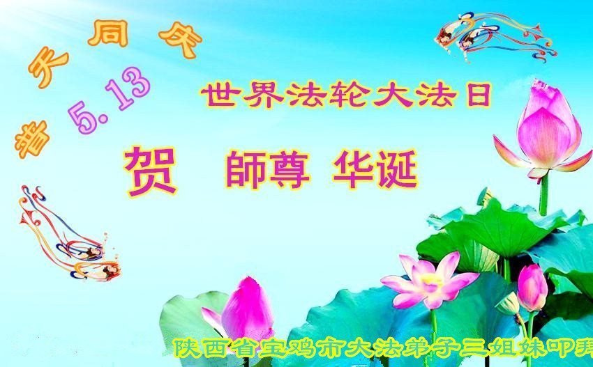 普天同庆世界法轮大法日! 师父您辛苦了!您为我们承受了那么多,弟子一定要多学法,做好三件事, 跟您回家! 陕西省宝鸡市全体大法弟子恭贺世界法轮大法日暨恭祝师父生日快乐!