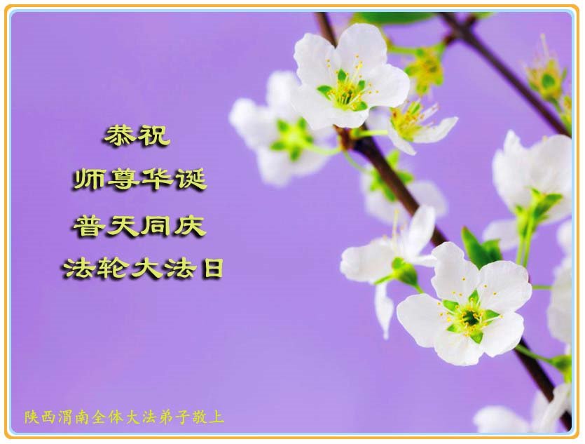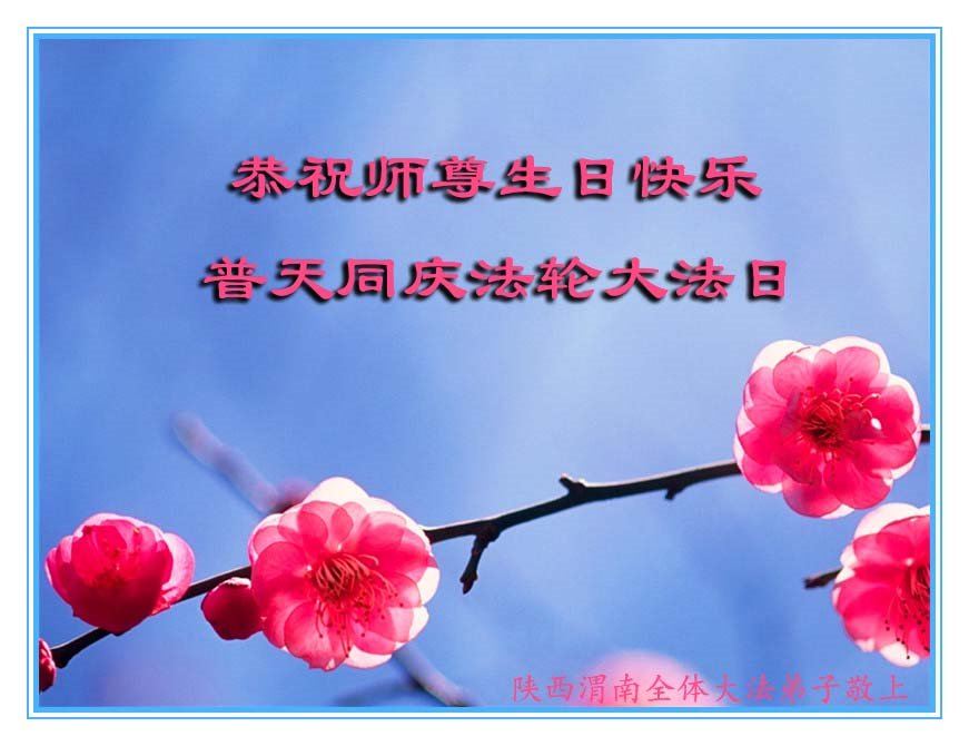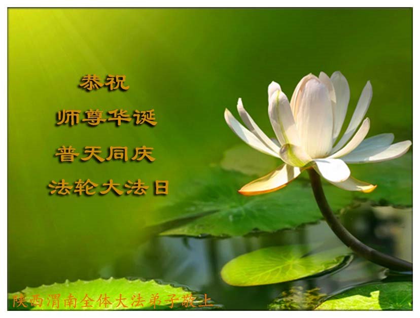 祝贺世界法轮大法日!恭祝师尊生日快乐! 尽力做好三件事、完成使命、期盼师父早日回归大陆! 陕西省渭南市全体大法弟子恭祝慈悲伟大的师父生日快乐!