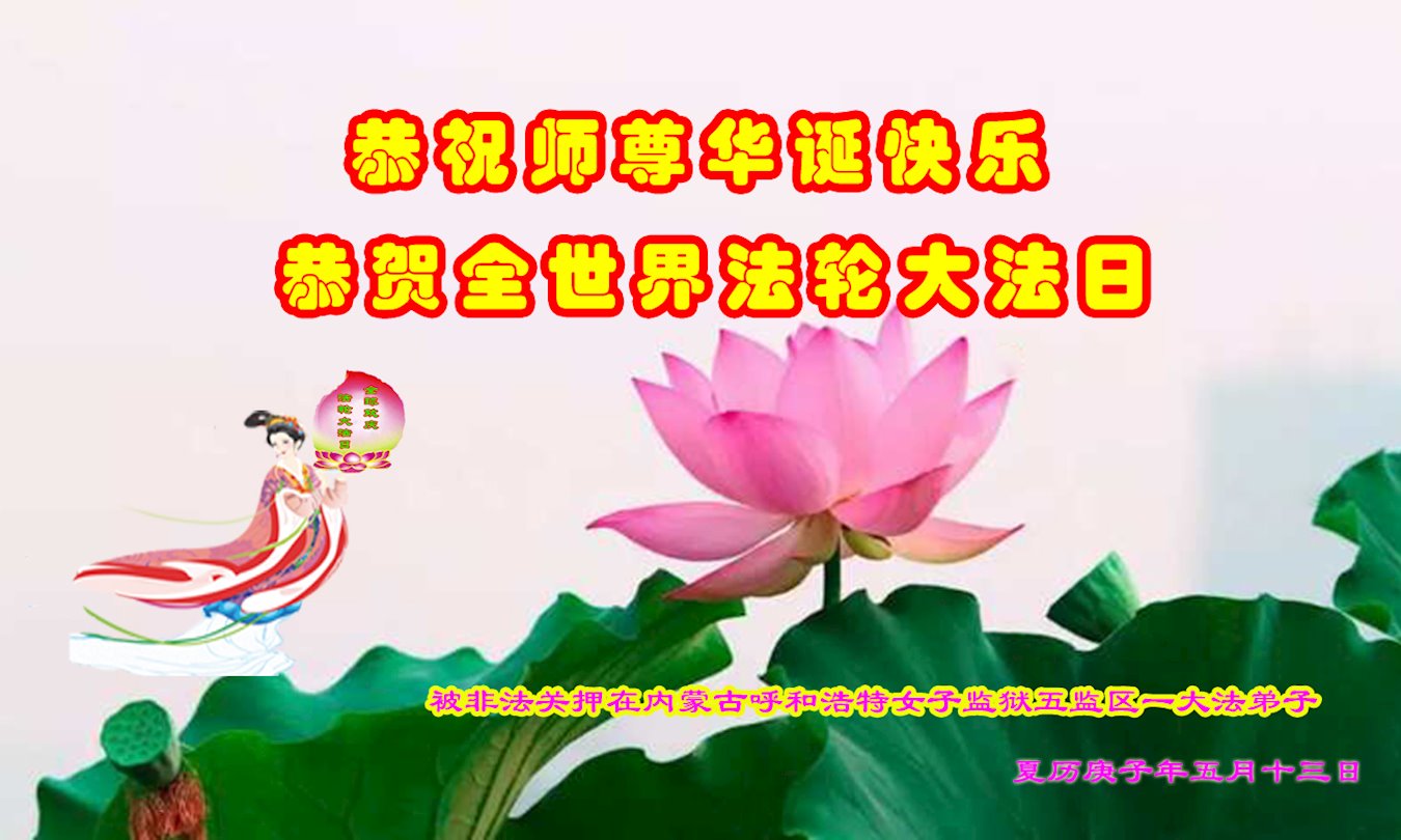 被非法关押在内蒙古呼和浩特女子监狱五监区的一大法弟子给慈悲伟大的师父问好!恭贺全世界法轮大法日!祝愿师尊每一个节日快乐! 辽宁省沈阳市被非法关押的大法弟子恭祝师尊生日快乐!