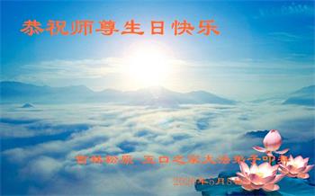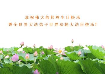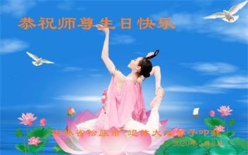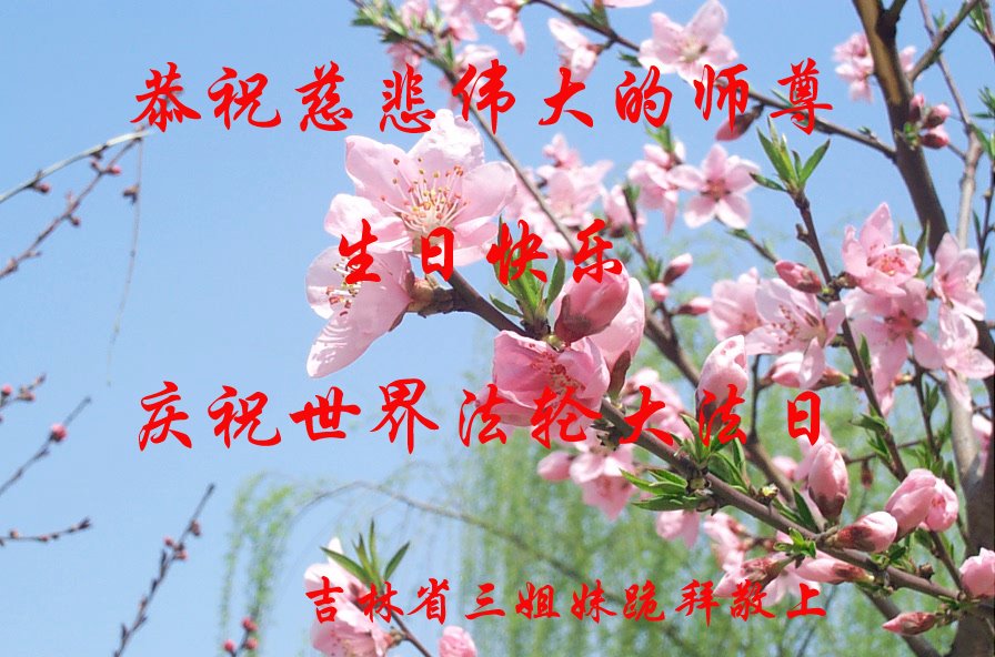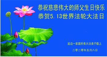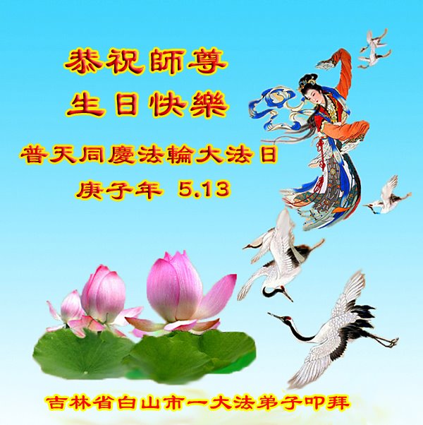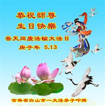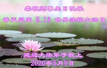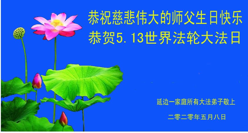 恭祝慈悲伟大的师尊生日快乐!恭贺世界法轮大法日好! 在新的一年里走好师尊安排的路,做好三件事,通天大道勇猛精進,修去执着无遗漏,跟上师父正法進程,圆满随师还。 吉林省公主岭市大法弟子敬贺 二零二零年五月七日 吉林省延边州大法弟子恭祝慈悲伟大的师父生日快乐!