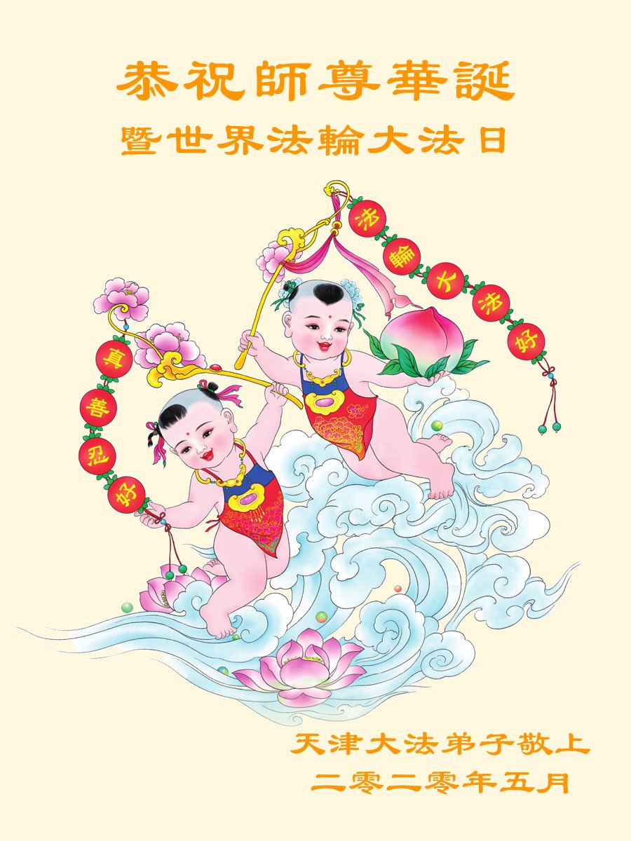 恭祝慈悲的师尊生日快乐!同祝世界法轮大法日! 尊敬的师尊,弟子们要珍惜这万古圣缘,以法为师、实修自己、做好三件事,不辜负师尊的慈悲救度! 天津一老年学法小组大法弟子敬上 二零二零年五月二日 天津市大法弟子恭祝慈悲的师尊华诞!恭贺世界法轮大法日!