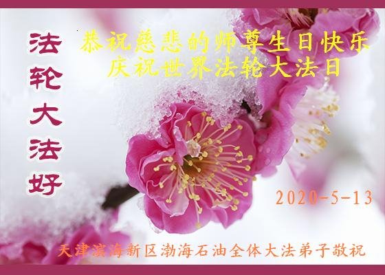 喜庆世界法轮大法日! 岁月蹉跎众惊醒 感恩师尊创新宇 大法弟子助师行 从返苍穹更辉煌 天津市滨海新区全体大法弟子敬祝 2020年5月10日 天津市河西大法弟子恭祝师尊生日快乐!