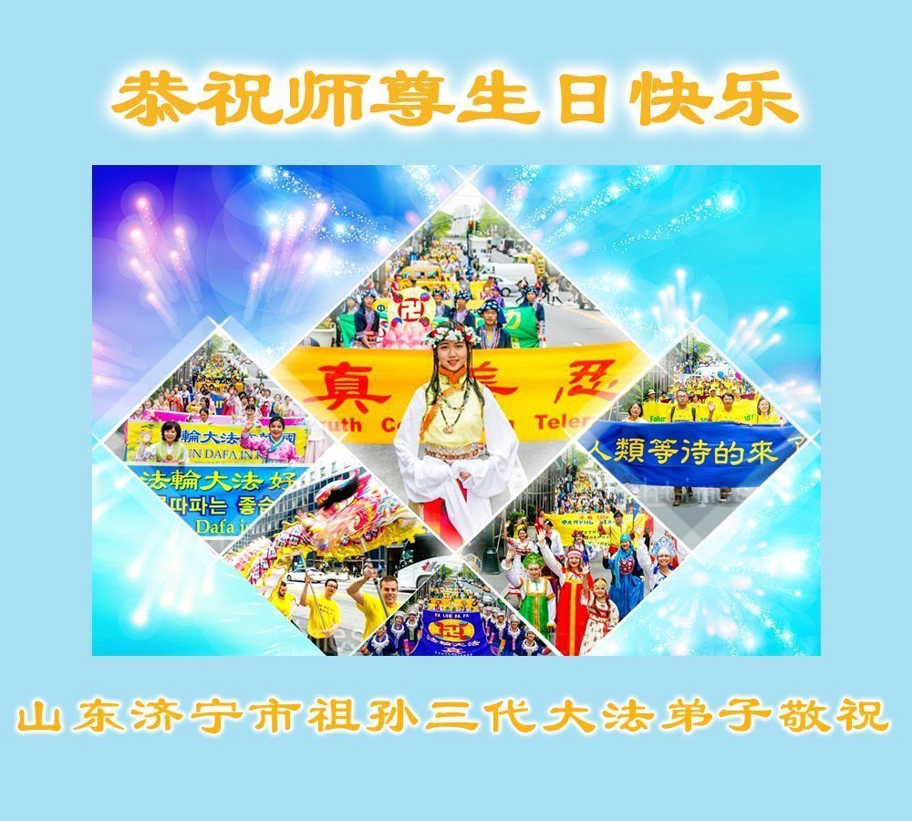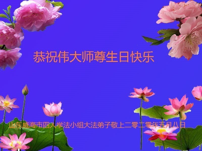 恭祝慈悲伟大的师尊生日快乐! 普天同庆世界法轮大法日! 山东济宁祖孙三代大法弟子敬祝 山东威海市四人学法小组大法弟子:恭祝伟大师尊生日快乐!
