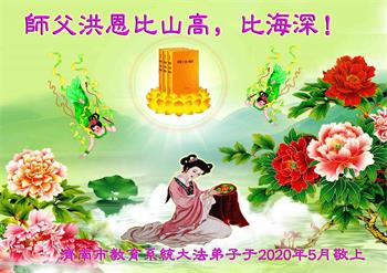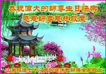 感谢师父把濒临死亡的我救活,二十三年来没有去医院,没吃一片药,强健了我的身体,净化了我的心灵,使我这个唯利是图争强好胜的人,变成了一个一切能顺其自然,并尽力做到遇事为别人着想的人。感谢师父对我全家人的保护。我一人炼功,全家人都跟着受益。孙女遇车祸毫发无损,诚心默念“法轮大法好”、“真善忍好”,高考取得好成绩,孩子们都工作顺利,平平安安。我们全家人都牢记九字真言,并按“真善忍”这宇宙最高标准规范自己的言行。我们全家人恭祝慈悲伟大的师父生日快乐! 山东省济南市教育系统大法弟子恭祝师尊生日快乐!恭贺世界法轮大法日!