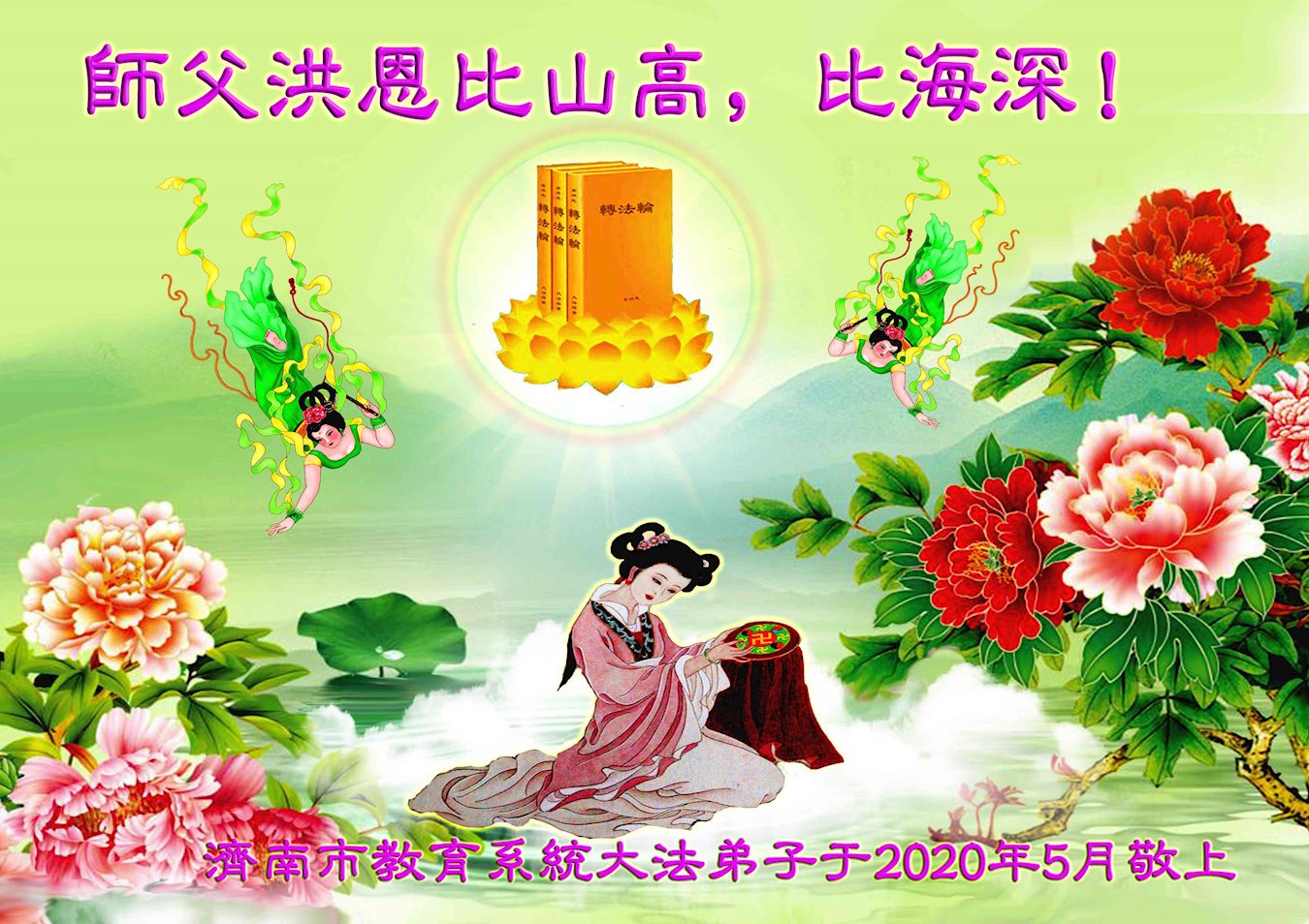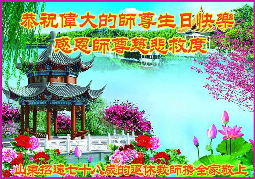 慈悲伟大的师父:您好!时光飞逝如梭穿,正法進程又一年。沐浴着“真、善、忍”的法光,流光溢彩的五月又迎来了普天同庆、同颂、神圣的、感恩的日子。值此,成都市一中学教师学法小组大法弟子带着感恩、思念之心,带着满满的祝愿,千言万语化作心里话:师父,请接受我们发自心灵深处的无限感恩与叩拜!请让我们对您说一声:师父,弟子想念您!祝您生日快乐!回首修炼的艰辛历程,是师父的洪大慈悲、是师父的无量智慧看护着我们一步步、一天天走向成熟。佛恩浩荡!進入2020年,一切都在变化中,一月爆发的中共病毒瘟疫,至今已蔓延全世界200个国家,中共的骗世清零,还会导致更大疫情。时不待人,弟子更要抓紧讲真相救人,完成好自己的使命,告之世人,中共已经到了即将灭亡的前夜了,不与中共伍,灾难不近身。再次谢谢师父的巨大承受!谢谢师父的慈悲苦度!法轮大法好!真善忍好!合十 山东省烟台市招远市一名七十八岁的退休教师携全家恭祝伟大的师尊生日快乐!