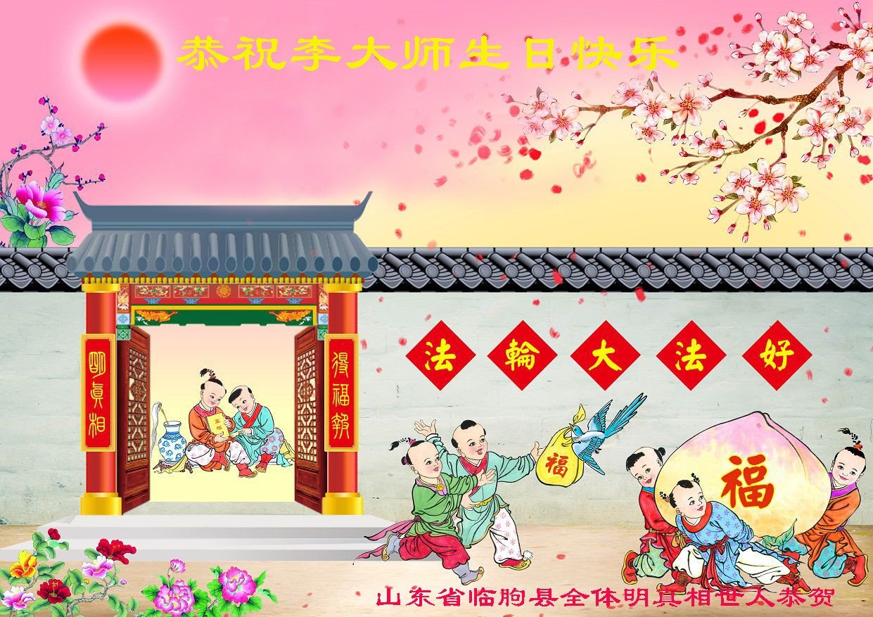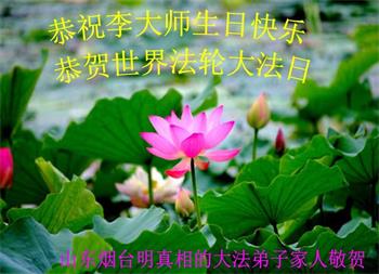 弟子及明真相的儿子、儿媳、孙女祝师尊生日快乐!儿子说:在这5.13世界法轮大法的大好日子里,我们全家人感谢师父的救度之恩!使我找到了人生归途,我按照师父教导的真善忍做好人,工作顺利、媳妇善良、女儿聪明。女儿每次回老家,先到师父法像前跪拜师父!我们全家人感谢师父的救度之恩!今后我们更坚信大法,迎接法正人间的到来。谢谢师父! 山东省临沂蒙阴县五位大法弟子及明真相的家人向慈悲伟大的师尊问好!恭祝慈悲伟大的师父生日快乐!