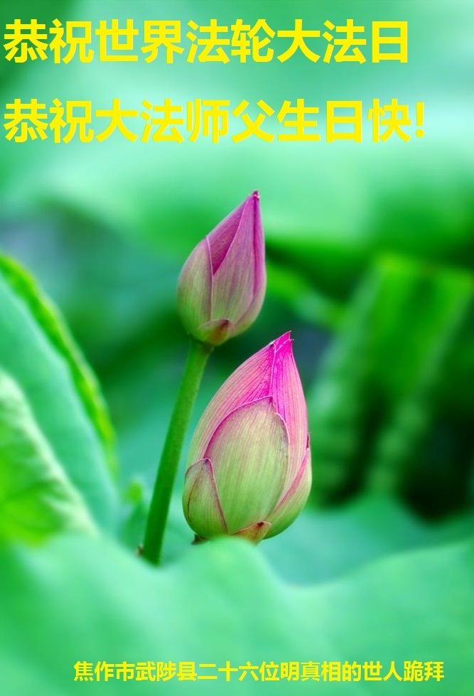 在世界法轮大法日到来之际,作为一名明白了真相的大法弟子的家人我真心的祝愿李大师生日快乐!恭贺世界法轮大法日!感谢您的慈悲救度! 山东烟台一明真相的大法弟子家人敬上 河南省焦作市武陟县二十六位明真相的世人恭祝大法师父生日快乐!恭贺世界法轮大法日!