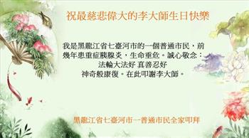 盼望大法师父早日回国和众生见面。 黑龙江省七台河市一普通市民全家恭祝最慈悲伟大的李大师生日快乐!