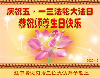 叩谢师尊救度之恩!恭贺世界法轮大法日! 二零二零年五月 辽宁省沈阳市三位大法弟子恭贺法轮大法日!恭祝师尊生日快乐!