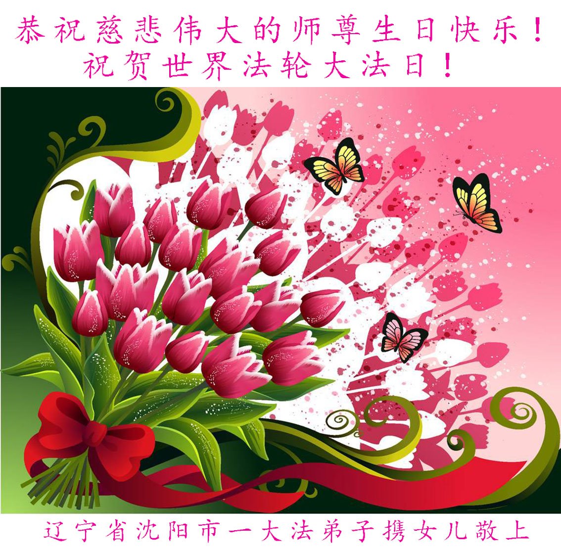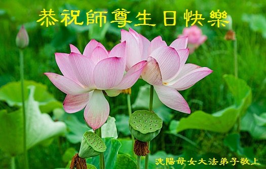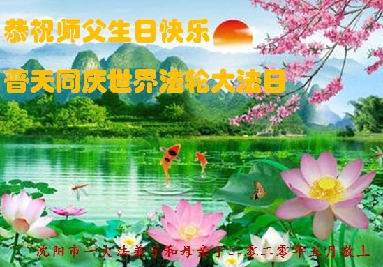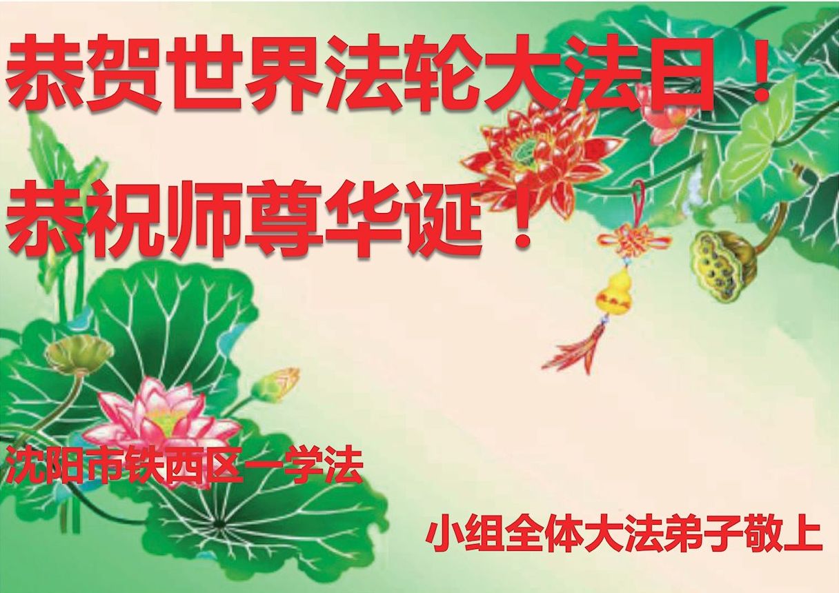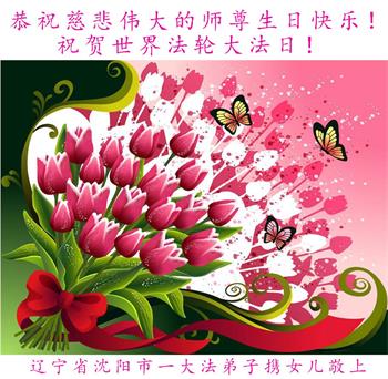 在这普天同庆的日子里,我代表我们全家恭祝师尊生日快乐!法轮大法好!真善忍好!代表我们三个学法小组里的同修向师尊问好,感谢师尊慈悲苦度!洗净我们的身心,带我们走上回家的路,让我们成为最幸福最幸运的人!我们同祝同庆世界法轮大法日! 辽宁沈阳大法弟子姐妹恭祝师尊生日快乐!