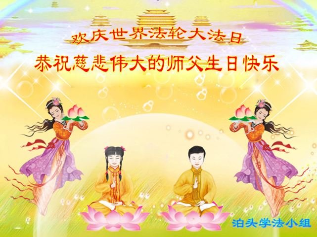 恭祝慈悲伟大的师尊生日快乐!祝贺法轮大法洪传世界二十八周年,祝贺世界法轮大法日! 河北泊头一学法小组全体成员 河北省衡水市大法弟子恭祝世界法轮大法日暨师父生日快乐!