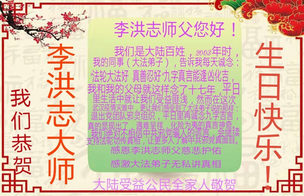热烈庆祝5.13世界法轮大法日! 宜昌市五区(西陵区、点军区、伍家岗区、夷陵区、猇亭区),五县(秭归县、远安县、长阳县、五峰县、兴山县),三市(宜都市、枝江市、当阳市),全体宜昌地区大法弟子: 恭祝师父生日快乐!热烈庆祝5.13世界法轮大法日!法轮大法好! 2020年5月10日 大陆湖北省武汉受益公民全家人敬贺大法师父生日快乐!