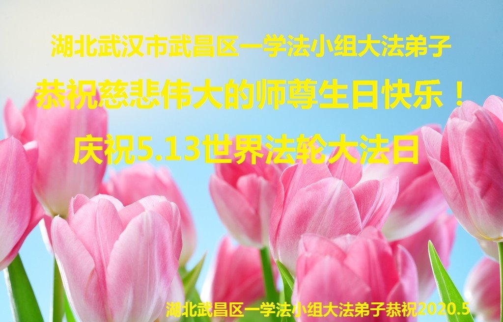 在法轮大法日即将来临之际,我们家庭学法小组大法弟子恭祝慈悲伟大的师尊生日快乐! 弟子们一定做好正法时期大法弟子的三件事,在疫情期间抓紧时间救度众生,圆满随师还,请师尊放心!合十! 武汉市武昌区某家庭学法小组 二零二零年五月九日 湖北省武汉市江岸区一学法组全体大法弟子恭祝师尊生日快乐!普天同庆5.13世界法轮大法日!