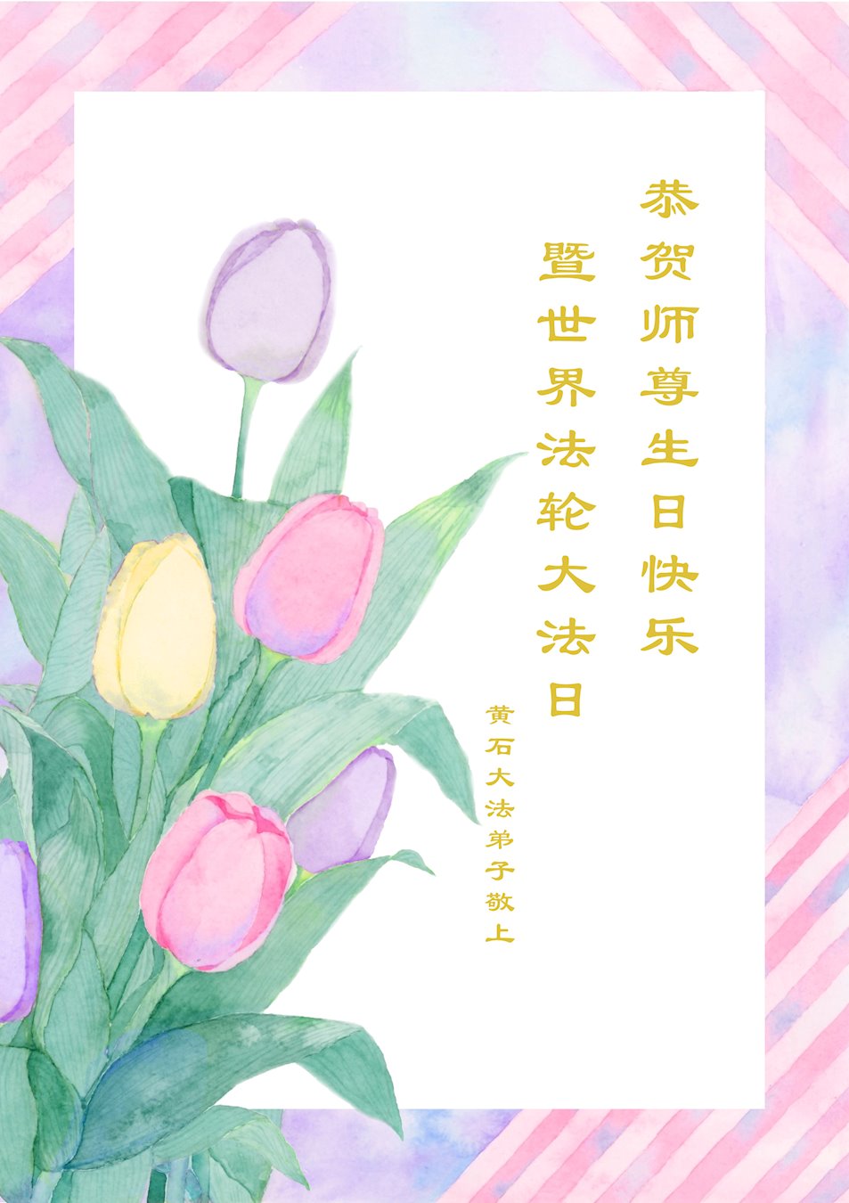 武汉市汉阳区一学法小组大法弟子恭祝5.13世界法轮大法日暨师尊华诞!我们一定会走好走正最后的路,请师尊放心。 湖北省黄石市大法弟子恭贺世界法轮大法日!