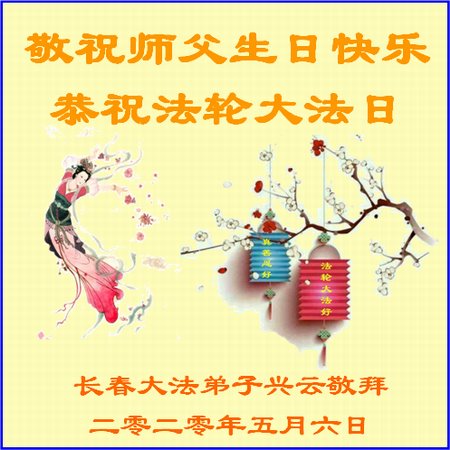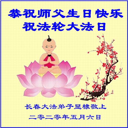 法轮大法光耀环宇救度苍生!普天同庆同祝同颂世界法轮大法日! 恭祝师尊生日快乐!感恩师尊慈悲救度! 叩拜!合十 吉林省长春市大法弟子敬上 二零二零年五月九日 吉林省长春市一学法小组大法弟子恭祝师尊生日快乐!