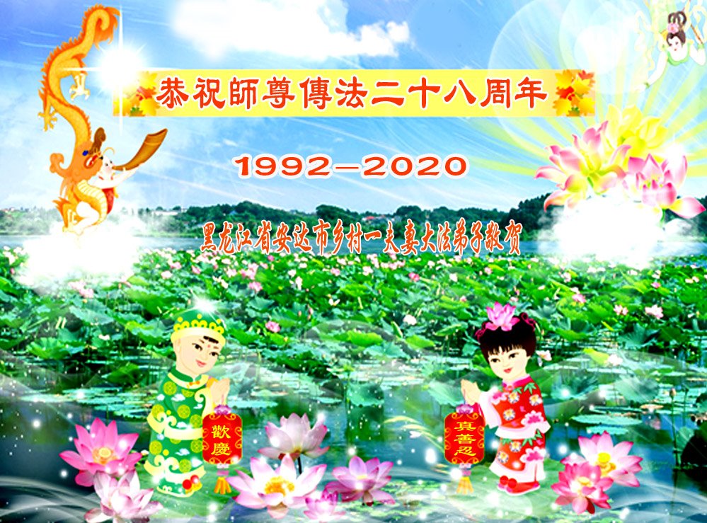热烈庆祝法轮大法洪传世间二十八周年!恭祝师尊生日快乐!穷尽人类之语言难表师尊救度之恩,我们唯有脚踏实地多学法,修好自己,多救人。跪谢师尊救度之恩!河北省元氏县城西三农村学法小组全体大法弟子跪拜!合十 黑龙江省绥化市安达市乡村一夫妻大法弟子恭祝师尊传法二十八周年!
