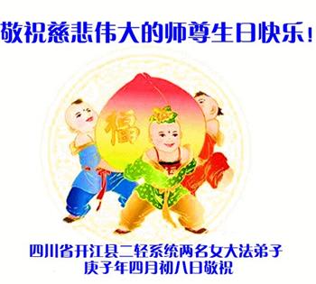 四川省达州市开江县二轻系统两名女大法弟子恭祝慈悲伟大的师尊生日快乐!