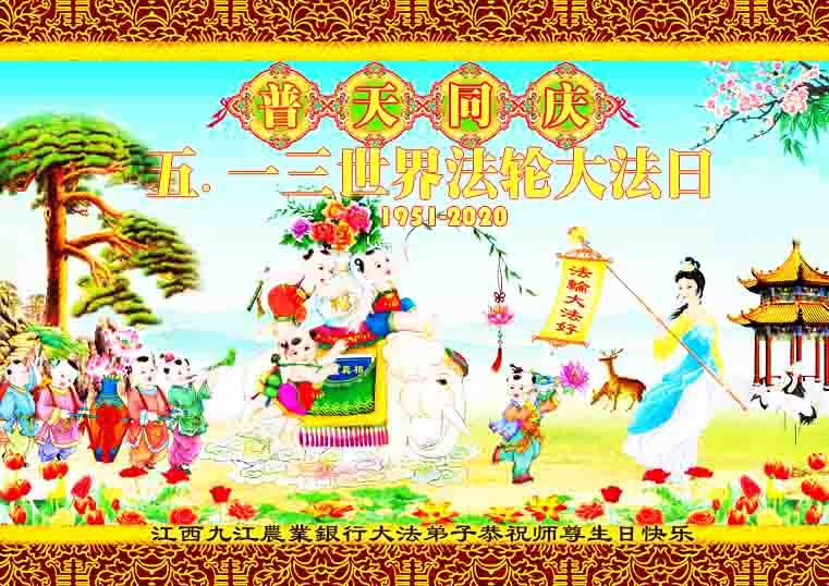 普天同庆5.13世界法轮大法日! 颂师恩 师尊正法,神州处处春,苍宇换新颜; 洪微十方,生机无限,感恩师尊救度,道不尽佛恩浩荡,力挽狂澜; 师尊普度,创世开天,传宇宙天机,不灭之法理,前无古人,后无来者; 机缘难得,幸运无以言表,更精進,兑誓约,斩妖除魔,助师行世间,证实大法路通天; 邪*党-来日无多,败物灰飞烟灭,宇宙正法洪势铺天盖地,雷霆万钧,寰宇光明显,普天处处颂赞师恩! 在师尊华诞来临之际,在世界法轮大法日来临的神圣日子里,弟子无限感恩慈悲伟大师尊的救度之恩!弟子一定谨记师尊教诲,正念正行,做好三件事,抓紧时间,兑现助师救度众生的神圣誓约,无悔的走好正法修炼之路,救度更多宝贵的生命,唯愿师尊笑! 弟子恭祝慈悲伟大的师尊生日快乐!法轮大法好!真善忍好! 江西九江农业银行大法弟子们满怀感恩的心恭祝师尊华诞!恭祝师尊生日快乐!普天同庆世界法轮大法日!