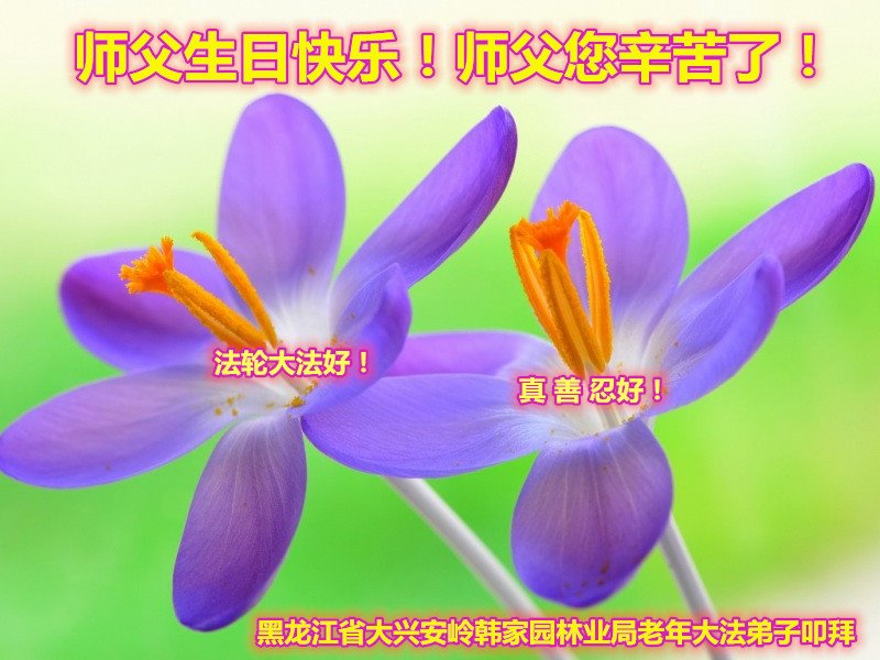 【明慧网二零二零年五月十三日】 黑龙江省大兴安岭韩家园林业局老年大法弟子恭祝慈悲伟大的师尊生日快乐!