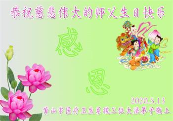 普天同庆世界法轮大法日! 安徽省黄山市医疗卫生系统三位大法弟子恭祝伟大的师父生日快乐!普天同庆世界法轮大法日!