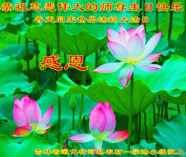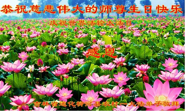 我们是农村大法弟子,没有太多文化,但是我们知道能有健康的身体、净化的心灵与为他的无私境界都是大法给的,也知道师尊用巨大的承受延续来的时间,是让我们修好自己救人的。无论环境如何变换,修炼的标准不变、对大法坚定的心不变、跟师尊回家的心不变。 吉林省通化柳河县农村一大法弟子恭祝师尊生日快乐!同庆世界法轮大法日!