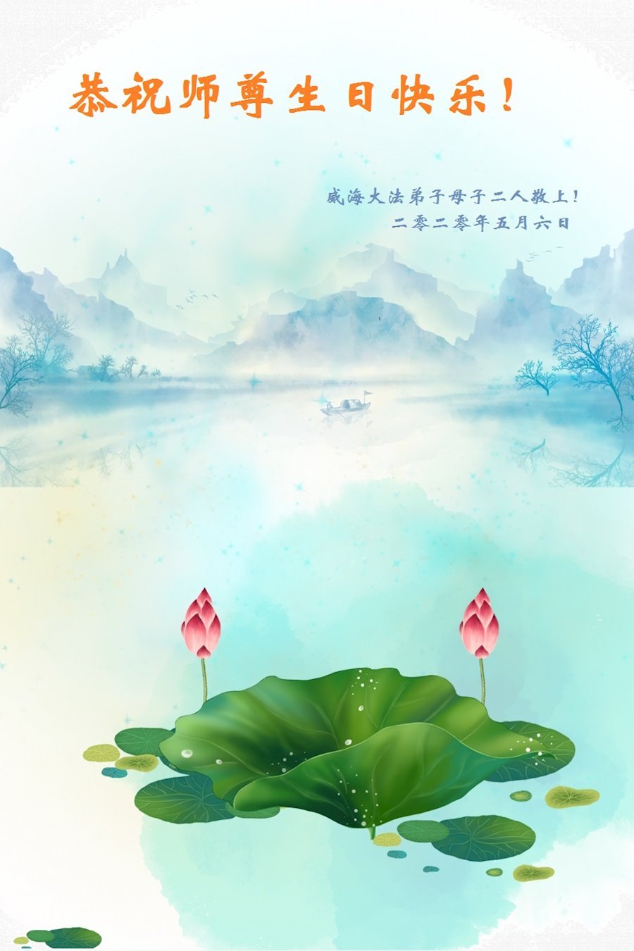 尊敬的师父,您好! 师父的生日暨法轮大法日将要到了,弟子祝师父生日快乐!弟子感谢师父这些年对我们一家人的付出与操劳。师父对弟子的关怀是用语言表达不来的。 弟子修炼法轮功也有20多年了,弟子的悟性很差,可弟子有坚定的信念,跟随师父修炼到底。弟子跪拜恩师! 山东平原大法弟子 2020年5月3日 山东威海大法弟子恭贺世界法轮大法日!恭祝慈悲伟大的师尊生日快乐!