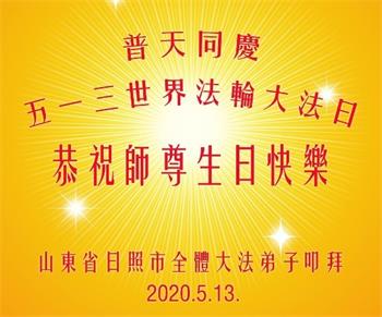 恭祝513法轮大法日来临! 在二十多年的修炼过程中,都是在师父的保护下走过来的。弟子叩谢师父。在这特殊的正法最后时刻,弟子牢记师父的教诲,“不要随着乱象浮动,守住根本”,勇猛精進,继续做好三件事,完成史前大愿,随师回家。 山东省济宁市大法弟子敬上 二零二零年五月三日 山东省日照市全体大法弟子恭祝师尊生日快乐!普天同庆五一三世界法轮大法日!