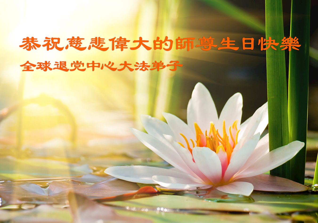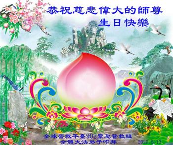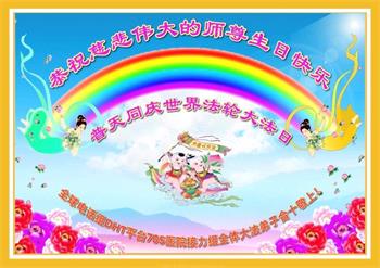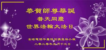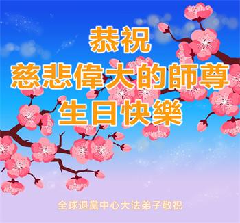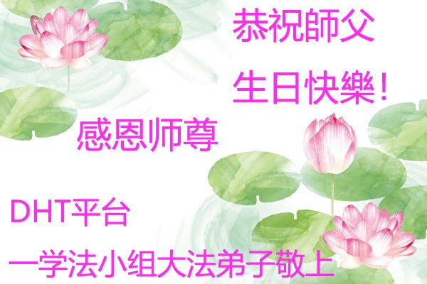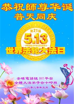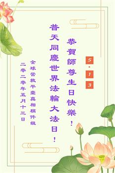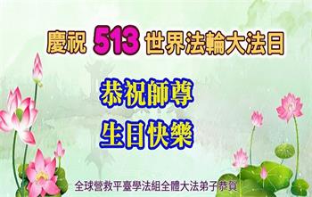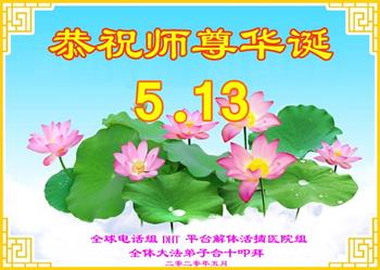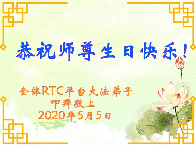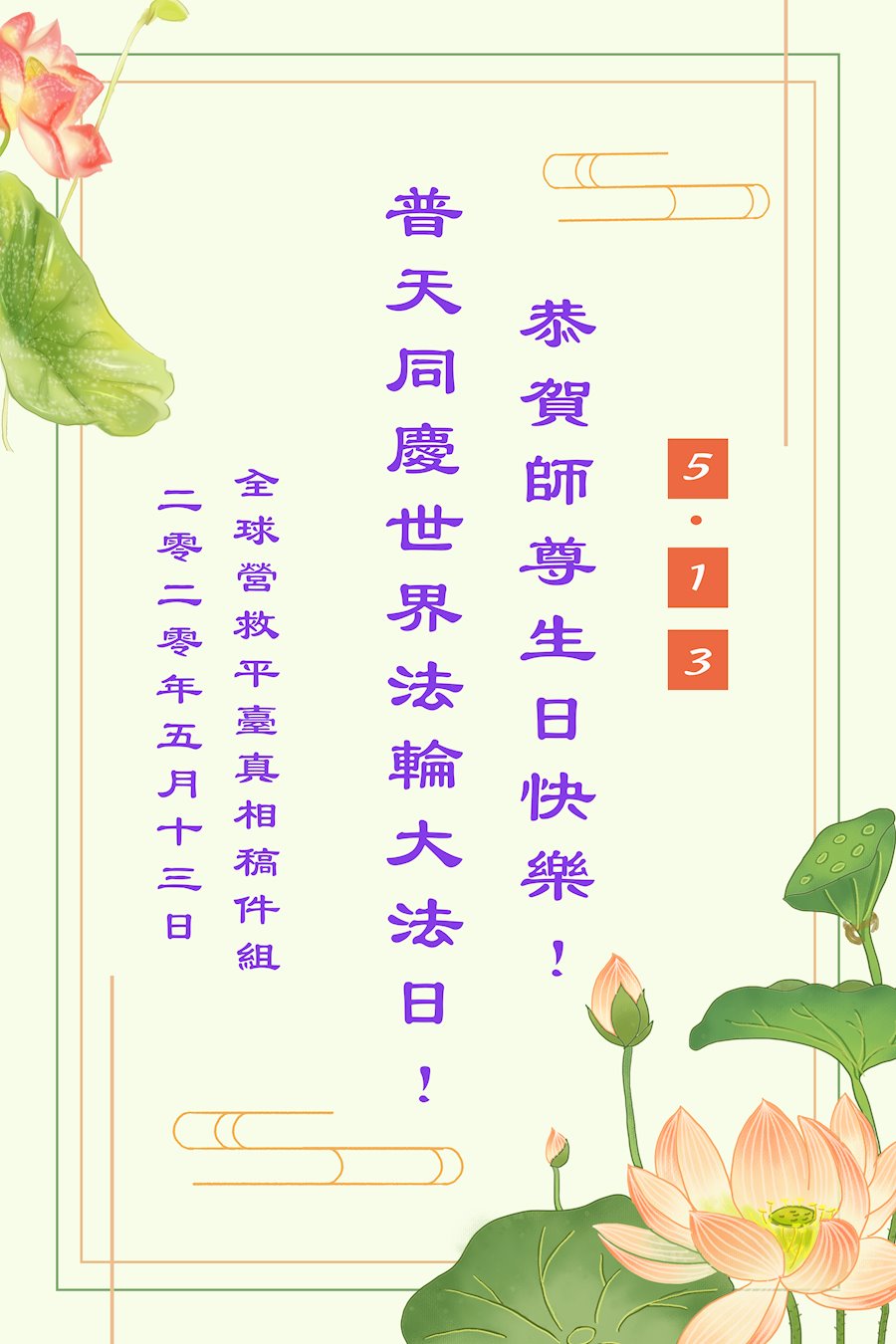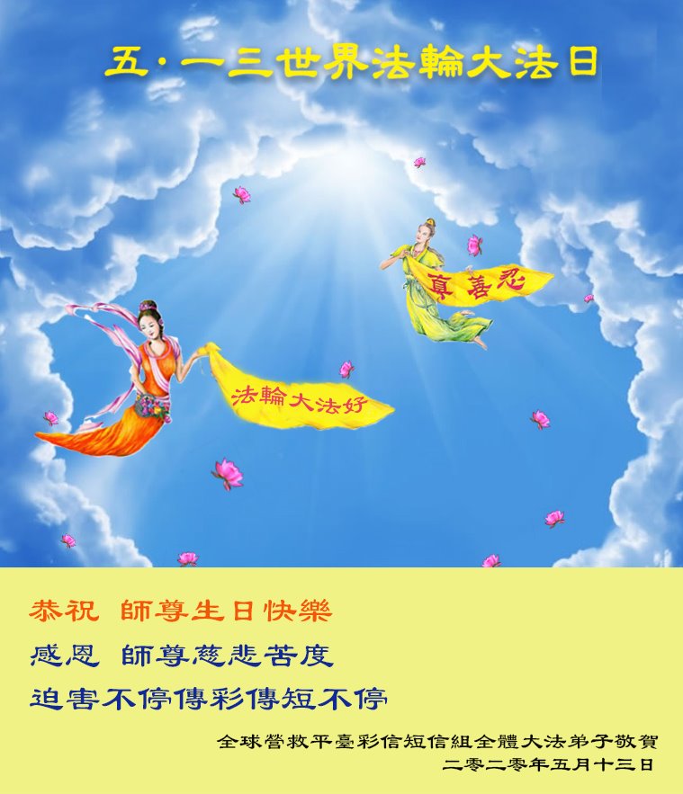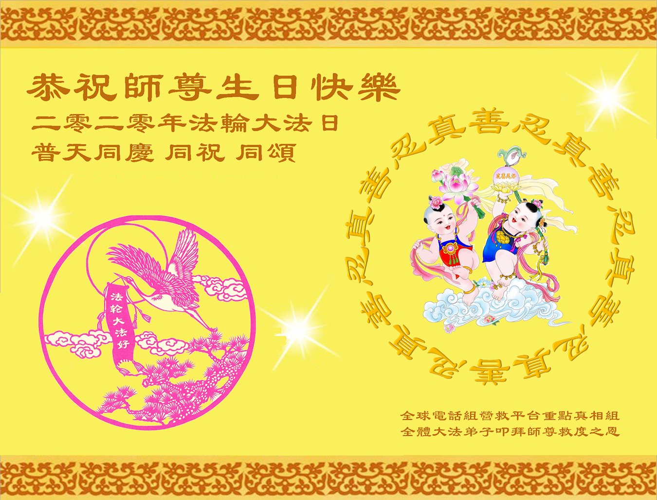 | 【明慧网二零二零年五月十三日】法轮大法弟子在世界各地把大法的福音传给各民族的有缘人,唤醒人们对生命回升的向往,认清共产邪灵在把人类拖入地狱。面对中共持续二十年的打压迫害,大法弟子们无私的全力付出,也唤醒了众多曾被谎言迷惑的中国人。 在大法洪传二十八周年的美好日子里,海外各真相小组的大法弟子们拜谢李洪志师父的救度之恩!珍惜师尊给延续来的时间,修好自己,快救人,兑现自己的誓约! 海外全球电话组DHT平台一小组全体大法弟子恭祝师尊华诞!恭祝慈悲伟大的师父生日快乐! 普天同庆同贺世界法轮大法日! 全球电话组DHT平台一小组全体大法弟子合十叩拜 台湾北区腰鼓队大法弟子恭祝师尊生日快乐!全球电话组营救平台一小组全体大法弟子恭祝师父生日快乐!慈悲伟大的师父好: 全球电话组营救平台一小组全体大法弟子恭祝师父生日快乐! 弟子们感谢师父赐予我们在一起打电话救人的机会和环境。我们在一起互相配合,在这个环境中不断的提升自己,修去自己的不足,用更纯净的心态营救中国国内被迫害的可贵的同修,救度中国国内可贵的公检法、610众生,把慈悲和善念带给对方,希望他们明白真相,了解参与迫害的严重后果,从而不再参与迫害,为自己和家人选择一个美好的未来;也希望能缓解中国国内同修们的艰难处境。 大家都是用心在做,修炼好自己,救人。谢谢师父对我们的慈悲看护。弟子们努力做好,回报师父为我们的付出和巨大的承受。 再一次恭贺师尊生日快乐! 全球电话组营救平台一小组全体大法弟子叩拜师尊救度之恩 全球电话组营救平台一小组全体大法弟子敬上 海外一真相小组大法弟子恭祝慈悲伟大的师尊生日快乐!五月十三日──这个神圣的日子, 海外一真相小组的弟子, 向师父献上最高的礼赞。 师父啊! 谢谢您亲驾法船,载我们归航。 弟子们永远记住这浩荡佛恩。 新西兰奥克兰太平超市讲真相大法弟子恭贺师尊华诞!恭贺世界法轮大法日! 全球电话组营救平台一小组恭祝师尊生日快乐!美国拉斯维加斯一老年大法弟子恭祝师尊生日快乐!恭贺世界法轮大法日! 正法已到最后的最后了,弟子讲真相救人急,用师尊给延续来的时间,加大力度学好法,向内找,修好自己,快救人是弟子们的当务之急。请师父放心,弟子一定兑现自己的誓约! 美国拉斯维加斯一老年大法弟子恭敬 营救平台一小组全体大法弟子恭祝慈悲伟大的师父生日快乐!弟子们恭祝慈悲伟大的师父生日快乐!弟子们感恩师父的慈悲救度与保护,师父您辛苦了! 美国纽约上州营救平台大法弟子恭祝师尊生日快乐! 弟子们一定珍惜时间,助师正法,救度众生。DHT电话平台一学法小组大法弟子恭祝慈悲伟大的师尊生日快乐!全球RTC平台全体大法弟子恭祝师尊生日快乐!全球电话组DHT平台一小组的全体大法弟子恭祝慈悲伟大的师尊华诞!普天同庆世界法轮大法日!慈悲伟大的师尊好!师尊,您辛苦了,为了众生的得救、为了大法弟子的修炼提升,您操尽了心!我们倾尽所有,也无以回报洪大如天的师恩;穷尽世上所有的语言,也无法表达我们对师尊的感恩! 值此普天同庆的日子里,我们小组的全体大法弟子,在此感恩伟大师尊的慈悲苦度:谢谢恩师!谢谢恩师!我们一定听师尊的话,互相配合好,做好三件事、修好自己、多救众生! 电话声声响 福音传神邦 只为唤醒迷中众 辨恶扬善离险滩 大法众徒齐协力 助师救人不放松 唤得众生本性出 末后得救法船蹬 全球电话组DHT平台一小组的全体大法弟子,再次叩谢师恩! 美国纽约中领馆真相点大法弟子恭贺师尊生日快乐!弹指一挥度弟子 巨难师尊扛 信大法 讲真相 正法一路辉煌 师尊生日快乐!师父辛苦了!我们大法弟子一定紧跟正法進程。 纽约中领馆真相点大法弟子敬上 全球.退:党!中心大法弟子恭祝慈悲伟大的师尊生日快乐!海外全球电话组DHT平台全体大法弟子恭祝师尊华诞!恭祝慈悲伟大的师父生日快乐! 普天同庆同贺世界法轮大法日! 朵朵净莲法中升 声声善念唤人醒 同心协力破万阻 各显神通传福音 师尊导航不迷途 红尘修心志不停 惜时珍缘把家还 普天同庆新宇明 全球电话组DHT平台全体大法弟子合十叩拜 希望.之声健康栏目全体大法弟子恭祝师尊生日快乐!全球营救平台一小组全体大法弟子恭祝慈悲伟大的师尊生日快乐!同庆世界法轮大法日!全球营救平台一小组全体大法弟子恭贺师尊生日快乐!全球电话平台一小组全体大法弟子恭祝慈悲伟大的师父生日快乐!弟子们恭祝慈悲伟大的师父生日快乐!恭贺世界法轮大法日! 感恩师父慈悲救度! 全球营救平台一小组全体大法弟子敬贺师尊生日快乐!慈悲伟大的师尊好:师尊生日快乐!感恩师尊慈悲苦度! 迫害不停传彩信传短信不停。我们互相配合好,在修炼好自己的同时,用一颗纯净的心向中国国内的公检法、610众生传递真相,制止迫害,营救同修。 谢谢师父对我们的慈悲看护! 全球营救平台一小组全体大法弟子敬上 全球营救平台一小组全体大法弟子恭贺师尊生日快乐!全球电话组DHT平台一小组全体大法弟子恭祝师尊华诞!恭祝慈悲伟大的师父生日快乐! 恭贺世界法轮大法日! 我们会珍惜生生世世亲缘,不忘初衷,不迷途,修好自己去人心,同心协力多救人,唯愿师尊笑! 全球电话组DHT平台一小组全体大法弟子合十叩拜