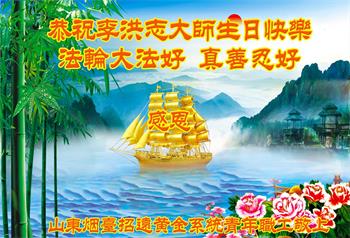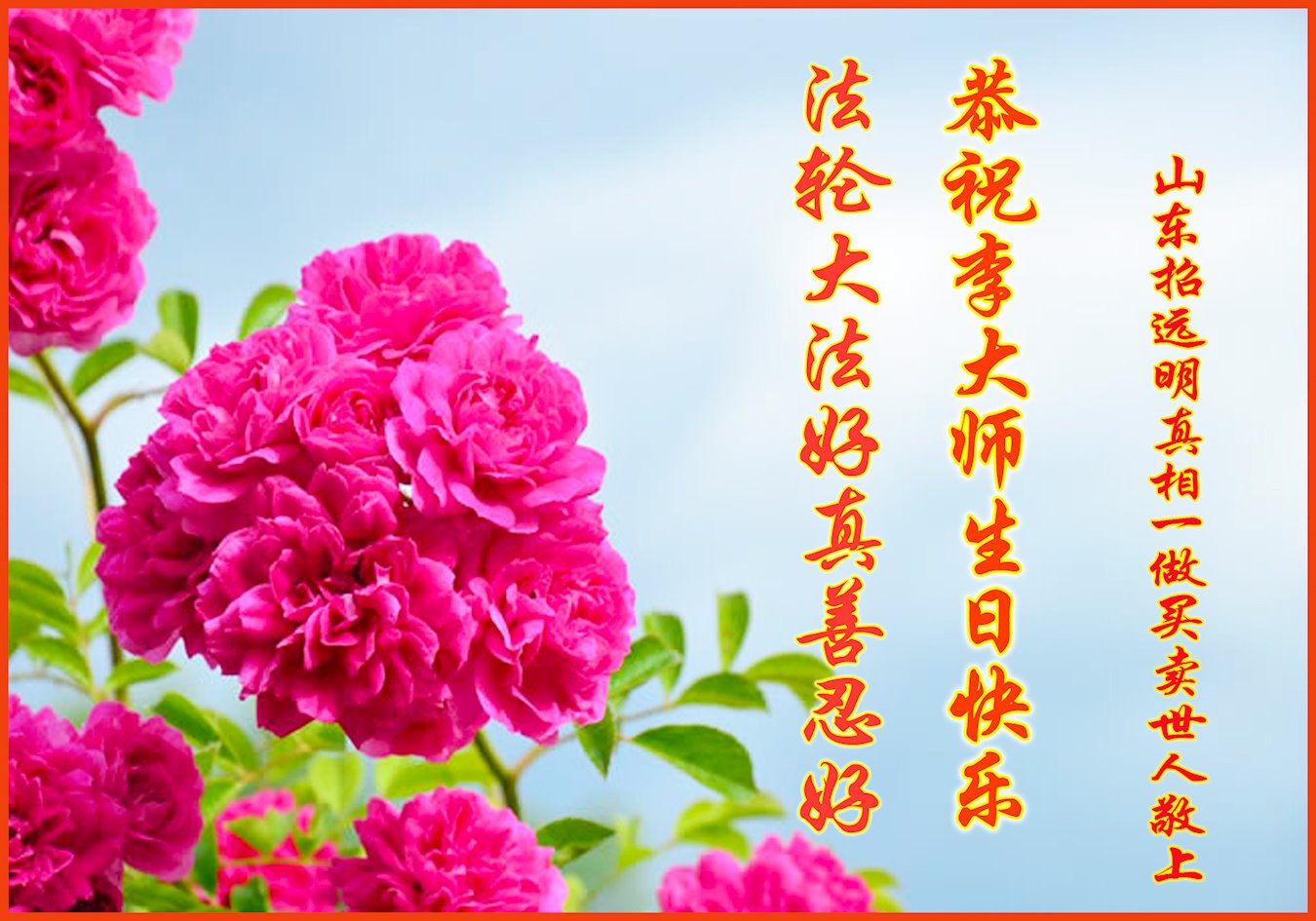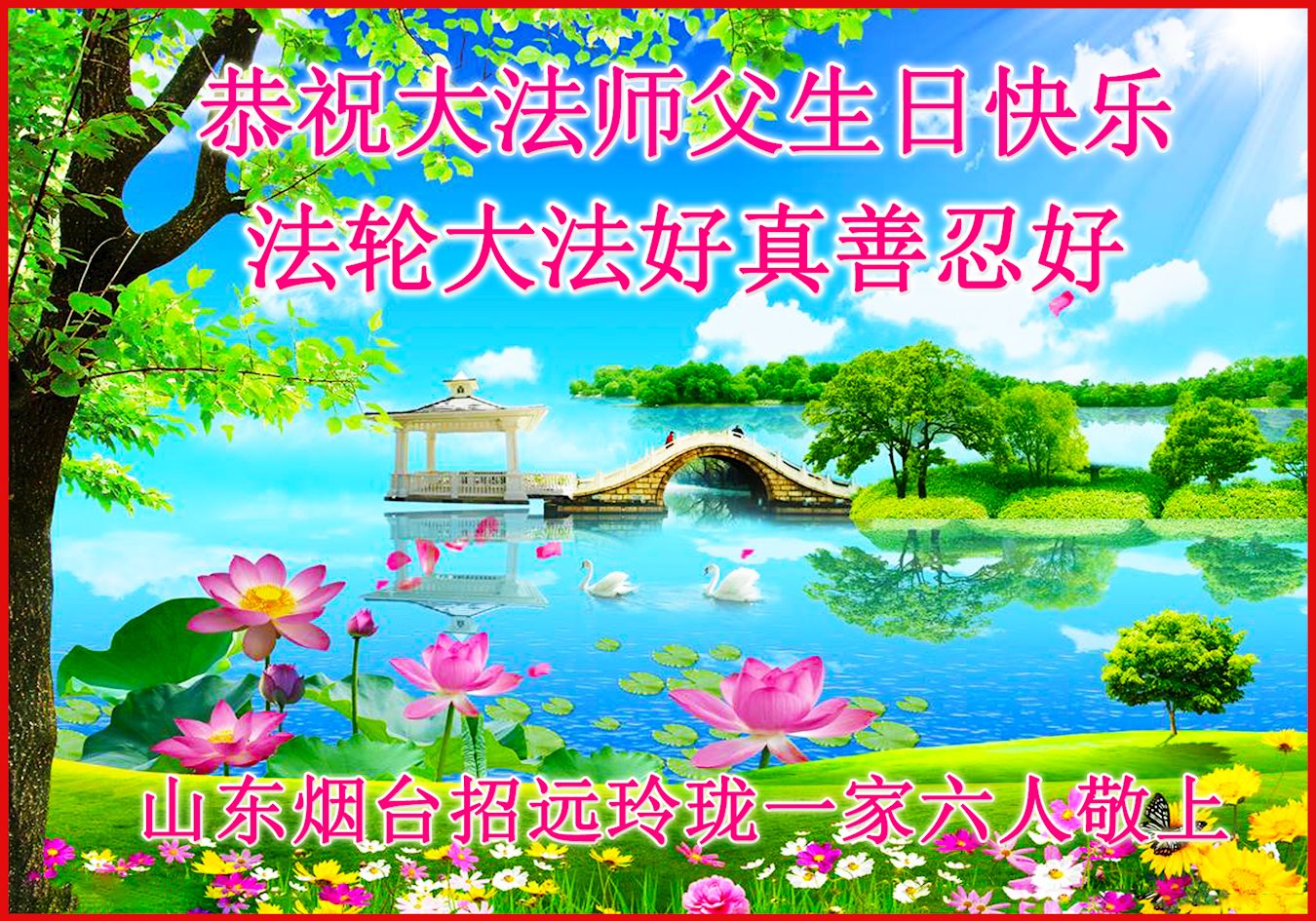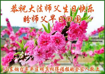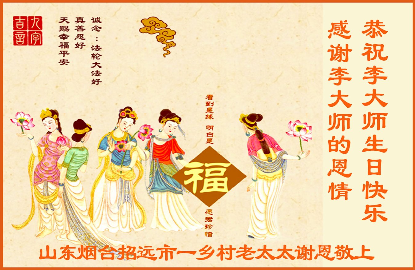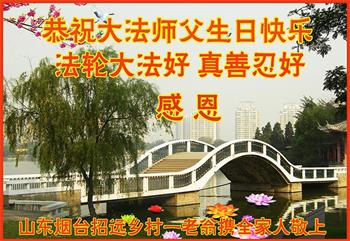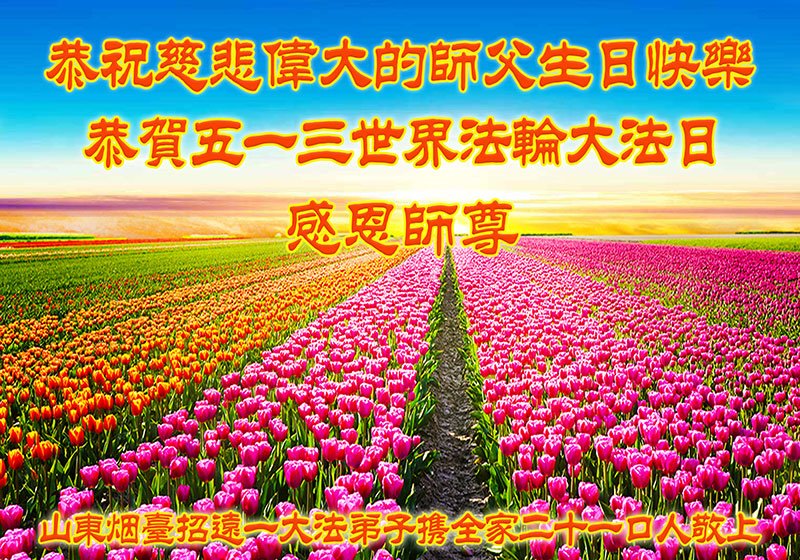 【明慧网二零二零年五月十三日】山东省烟台招远市一明真相军转干部恭祝大法师父生日快乐!我是胃癌手术后的幸存者。自从退出共产党的一切邪恶组织,真心诚念“法轮大法好,真善忍好”九字真言以来,我就停止了化疗,针也不打了,药也不吃了,每年去医院复查都很正常。 我真心相信法轮大法能救命,是个好功法!李大师是我的救命恩人。我祝愿李大师生日快乐!寿比南山! 山东省烟台招远市一位八十六岁乡村老太太恭祝李大师生日快乐!我今年八十六岁。几年来,我是真知道真相护身符管用,戴在身上真能保护不出事,我天天把护身符戴在身上。有一次,我提着一壶热水摔倒了,暖瓶摔碎了,热水洒了一地。但我不仅没有摔坏,热水也一点没有烫着我。我掏了掏布兜,护身符还在。从此,我知道护身符真管用。 前几天,我换衣服时,不小心把护身符弄丢了,我心里这个急呀。碰巧,我在街上遇见一个大法弟子给我讲真相,我又向她要了一个,真是及时雨啊! 我真诚的感谢李大师的恩情!恭祝李大师生日快乐! 山东省招远市黄金系统一青年职工恭祝李大师生日快乐!我是李大师从死亡线上抢救回来的一名青年职工。前些年我经常头疼,去医院检查确诊为脑干长瘤,必须手术治疗。住院后,医生告诉家人效果不一定能理想,手术后能活着也可能是个植物人,叫家人有个心理准备。 我的大姑妈告诉我们全家人诚心念“法轮大法好,真善忍好”九字真言,就能逢凶化吉。我们全家人都认真的念了,奇迹出现了!手术后,我很快恢复了知觉,而且预计的后遗症也没出现,对此医生都感到很惊奇。我们全家人都知道这是李大师给予的,我永远都不会忘记! 我代表全家人向李大师问候,并祝李大师生日快乐!正义必成! 山东省烟台市牟平区一大法弟子的女儿一家人恭祝大法师父生日快乐!爸爸、妈妈修炼大法二十多年了,也都快七十岁了。看到、听到别人家的父母今天这个病了、明天那个病了,今天住医院了、明天做手术了,而我们却不用操这个心。爸、妈每天学法、炼功,精神饱满,什么都能干,没有人说他们象七十岁的人了。 其实学法轮大法的人都是一群好人,他们努力按“真善忍”做好人,处处为别人着想,所以他们才身体健康。我们虽然不学大法,但我们知道法轮大法是正法,法轮大法是来救人的。瘟疫来了我们不害怕、不慌张,我们天天念:“法轮大法好,真善忍好!”我们家里有真相护身符,我们都做了三:退.,瘟疫上不了我们的身。我们有大法师父保护,无论发生什么灾难我们也不怕,诚心感谢师父的救度之恩! 山东省烟台招远市玲珑镇一家六口人恭祝大法师父生日快乐!我们全家人相信法轮大法、支持大法,都退出了邪*党-组织。我们支持大法弟子修炼,支持大法弟子救人。我们全家人经常念:“法轮大法好,真善忍好!”全家人幸福平安,生意兴隆。 感谢大法师父恩泽我们全家!感恩大法师父! 山东省烟台招远市一乡村妇女祝李大师生日快乐!去年下半年,我经常拉肚子,有时伴有疼痛感,身体一天天的消瘦,直到腊月二十五日,我肚子疼的不能干活了。去医院检查,医生说肠子上长了东西,需要做手术。我听后害怕了,怕长不好的东西。 我跟大姑姐说:“我能好吗?可能是到寿了吗?”大姑姐说:“不要往坏处想,只要诚心念‘法轮大法好,真善忍好’九字真言就能好。”于是我就天天念,结果手术很成功,切掉三十六块虫息肉。化验后,结论为没有病变。三天后,我就出院回家了。 我知道这是李大师救了我,我深深的感谢李大师的救命之恩!我和全家人诚心的祝李大师生日快乐! 山东省招远市一卖鱼小摊贩恭祝李大师生日快乐!我常年赶大集卖咸鱼,这是小本买卖。自从我相信大法、爱看大法(真相)资料、做了三:退.、并经常念:“法轮大法好,真善忍好”之后,我的买卖红火,人们都愿意买我的东西。这是因为我也按真善忍做好人,不坑人,不骗人,态度和善,服务周到。 感谢李大师传大法救人,谢谢李大师对我的关照!我诚心的敬祝李大师生日快乐! 山东省烟台招远市乡村一老翁携全家人恭祝李大师生日快乐!我是一个八旬老汉,我能活到今天都是李大师的恩赐。我没有花一分钱,只是诚心敬念“法轮大法好,真善忍好”,肠癌就好了。已经六年没有吃药打针了,每年去医院复查都正常。 我们全家人都相信法轮大法好,相信法轮大法能救人;都做了三:退.;都不相信中共邪*党-欺骗老百姓的那些鬼话了。相信法轮功早晚要平反,这个日子不会太远了! 我们全家人恭祝伟大的李大师生日快乐! 山东省招远市一大法弟子携全家二十一口人恭祝慈悲伟大的师父生日快乐!恭贺世界法轮大法日!尊敬的师父您好!我们全家人在您的佛光普照下,健康快乐!的生活着。我们都相信法轮大法是最好、最正的法。特别是经过了这二十多年不寻常的岁月,我们更加认识到了法轮大法的伟大,师父的伟大。法轮大法是真正来救人的高德大法。 山东省烟台招远市金岭农村明白真相的世人恭祝师父生日快乐!世界法轮大法日即将到来,感恩大法师父对我们全家的护佑!使我们明白真相,受益多多。 在此代表全家人恭祝师父生日快乐!庆祝世界法轮大法日!