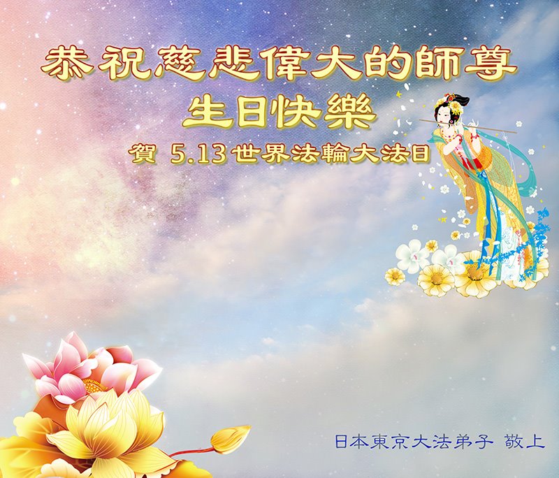 正法经历了21年的风风雨雨,师尊牵着我们的手走过来了。众生的罪业您一身承担,您用巨大的慈悲善化着宇宙中的一切,即使我们用尽人世所有的话,也无法表达我们对您的感恩,我们感谢师尊给予我们的一切!在5月13日,这个普天同庆的日子里,我们感恩师尊!谢谢师尊!谢谢师尊!在最后的时刻,我们要紧紧跟随师尊走到最后,多学法,修好自己,多救人,做好我们该做的事。谢谢师尊! 日本东京大法弟子恭祝慈悲伟大的师尊生日快乐!
