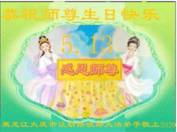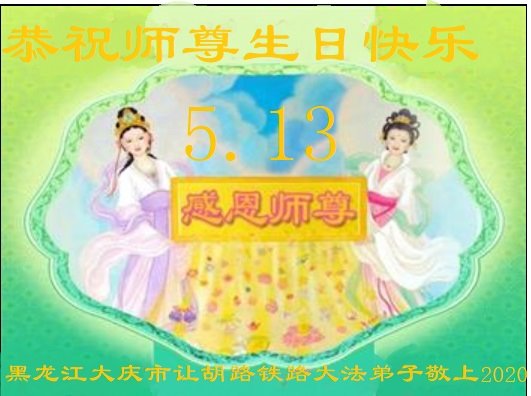 普天同庆五·一三世界法轮大法日! 精進实修紧随师 大疫面前多救人 放下人心显神功 有师有法万事通 山西省大同铁路全体大法弟子敬上 二零二零年五月九日 大陆税务系统全体大法弟子恭祝慈悲伟大的师尊生日快乐!