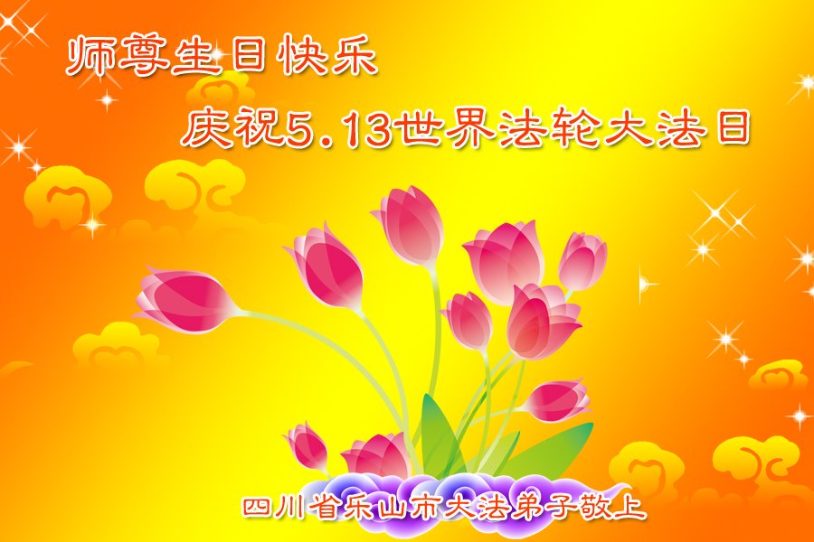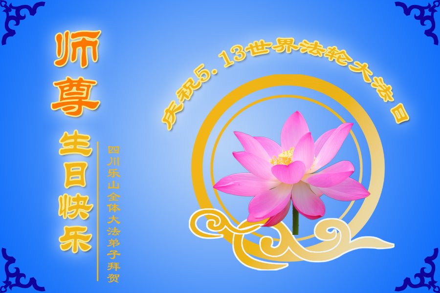 在五·一三这一伟大殊胜喜庆的日子里,大法弟子迎来了慈悲伟大师尊华诞暨第二十一届世界法轮大法日!天上人间同庆、同颂、同贺这一神圣伟大的节日!弟子跪拜师尊!谢谢师尊的慈悲苦度! 四川乐山全体大法弟子恭祝师尊生日快乐!庆祝世界法轮大法日!