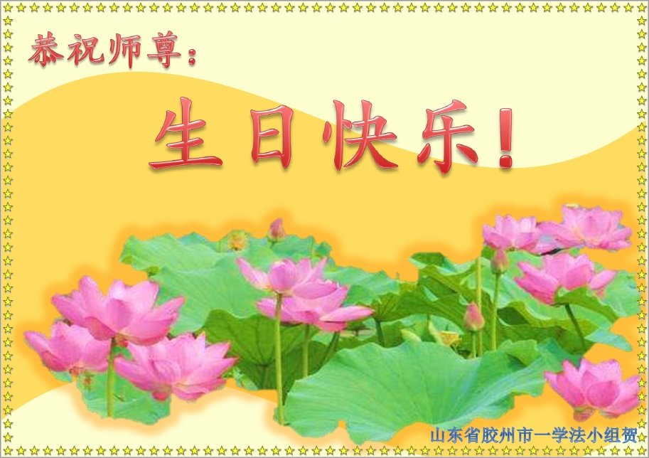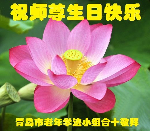 感恩师父!提笔想成章,热泪已盈眶。肺腑的千言万语诉不完师尊的佛恩浩荡!洪大的慈悲无比的和祥不止的加持给我们正的能量!我们走到今天,师尊为我们承受的太多太多!为我们付出的太大太大!我们对师尊的感恩无以言表!我们唯有按师尊所嘱,学好法,修好自己,多救人,完成使命,让师尊少一份操劳,多一点欣慰。这是我们大法弟子对师尊的最好感恩! 恭祝师父生日快乐!同贺世界法轮大法日! 山东青岛市一学法小组大法弟子恭祝师尊生日快乐暨世界法轮大法日!感恩师父!